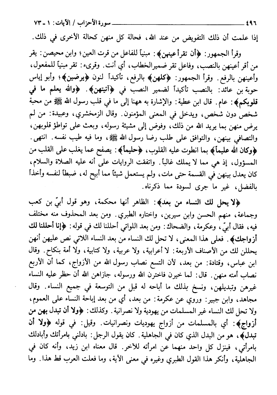 لَا يَحِلُّ لَكَ النِّساءُ مِنْ بَعْدُ: الظَّاهِرُ أَنَّهَا مُحْكَمَةٌ، وَهُوَ قَوْلُ أُبَيِّ بْنِ كَعْبٍ وَجَمَاعَةٍ، مِنْهُمُ الْحَسَنُ وَابْنُ سِيرِينَ، وَاخْتَارَهُ الطَّبَرِيُّ. ومن بَعْدُ الْمَحْذُوفُ مِنْهُ مُخْتَلَفٌ فِيهِ، فَقَالَ أُبَيٌّ، وَعِكْرِمَةُ، وَالضَّحَّاكُ: وَمِنْ بَعْدِ اللَّوَاتِي أَحْلَلْنَا لَكَ فِي قَوْلِهِ: إِنَّا أَحْلَلْنا لَكَ أَزْواجَكَ. فَعَلَى هَذَا الْمَعْنَى، لَا تَحِلُّ لَكَ النِّسَاءُ مِنْ بَعْدِ النِّسَاءِ اللَّاتِي نُصَّ عَلَيْهِنَّ أَنَّهُنَّ يَحْلِلْنَ لَكَ مِنَ الْأَصْنَافِ الْأَرْبَعَةِ: لَا أَعْرَابِيَّةً، وَلَا عَرَبِيَّةً، وَلَا كِتَابِيَّةً، وَلَا أَمَةً بِنِكَاحٍ. وَقَالَ ابْنُ عَبَّاسٍ، وَقَتَادَةُ: مِنْ بَعْدُ، لِأَنَّ التِّسْعَ نصاب رسول الله مِنَ الْأَزْوَاجِ، كَمَا أَنَّ الْأَرْبَعَ نِصَابُ أُمَّتِهِ مِنْهُنَّ. قَالَ: لَمَّا خُيِّرْنَ فَاخْتَرْنَ اللَّهَ وَرَسُولَهُ، جَازَاهُنَّ اللَّهُ أَنْ حَظَرَ عَلَيْهِ النِّسَاءَ غَيْرَهُنَّ وَتَبْدِيلَهُنَّ، وَنَسَخَ بِذَلِكَ مَا أَبَاحَهُ لَهُ قَبْلُ مِنَ التَّوْسِعَةِ فِي جَمِيعِ النِّسَاءِ. وَقَالَ مُجَاهِدٌ، وَابْنُ جُبَيْرٍ: وَرُوِيَ عَنْ عِكْرِمَةَ: مِنْ بَعْدُ، أَيْ مِنْ بَعْدِ إِبَاحَةِ النِّسَاءِ عَلَى الْعُمُومِ، وَلَا تَحِلُّ لَكَ النِّسَاءُ غَيْرُ الْمُسْلِمَاتِ مِنْ يَهُودِيَّةٍ وَلَا نَصْرَانِيَّةٍ. وَكَذَلِكَ: وَلا أَنْ تَبَدَّلَ بِهِنَّ مِنْ أَزْواجٍ: أَيْ بِالْمُسْلِمَاتِ مِنْ أَزْوَاجٍ يَهُودِيَّاتٍ وَنَصْرَانِيَّاتٍ. وَقِيلَ: فِي قَوْلِهِ وَلا أَنْ تَبَدَّلَ، هُوَ مِنَ الْبَدَلِ الَّذِي كَانَ فِي الْجَاهِلِيَّةِ. كَانَ يَقُولُ الرَّجُلُ: بَادِلْنِي بِامْرَأَتِكَ وَأُبَادِلُكَ بِامْرَأَتِي، فَيَنْزِلُ كُلِّ وَاحِدٍ مِنْهُمَا عَنْ امْرَأَتِهِ لِلْآخَرِ. قَالَ مَعْنَاهُ ابْنُ زَيْدٍ، وَأَنَّهُ كَانَ فِي الْجَاهِلِيَّةِ، وَأَنْكَرَ هَذَا الْقَوْلَ الطَّبَرِيُّ وَغَيْرُهُ فِي مَعْنَى الْآيَةِ، وَمَا فَعَلَتِ الْعَرَبُ قَطُّ هَذَا. وَمَا