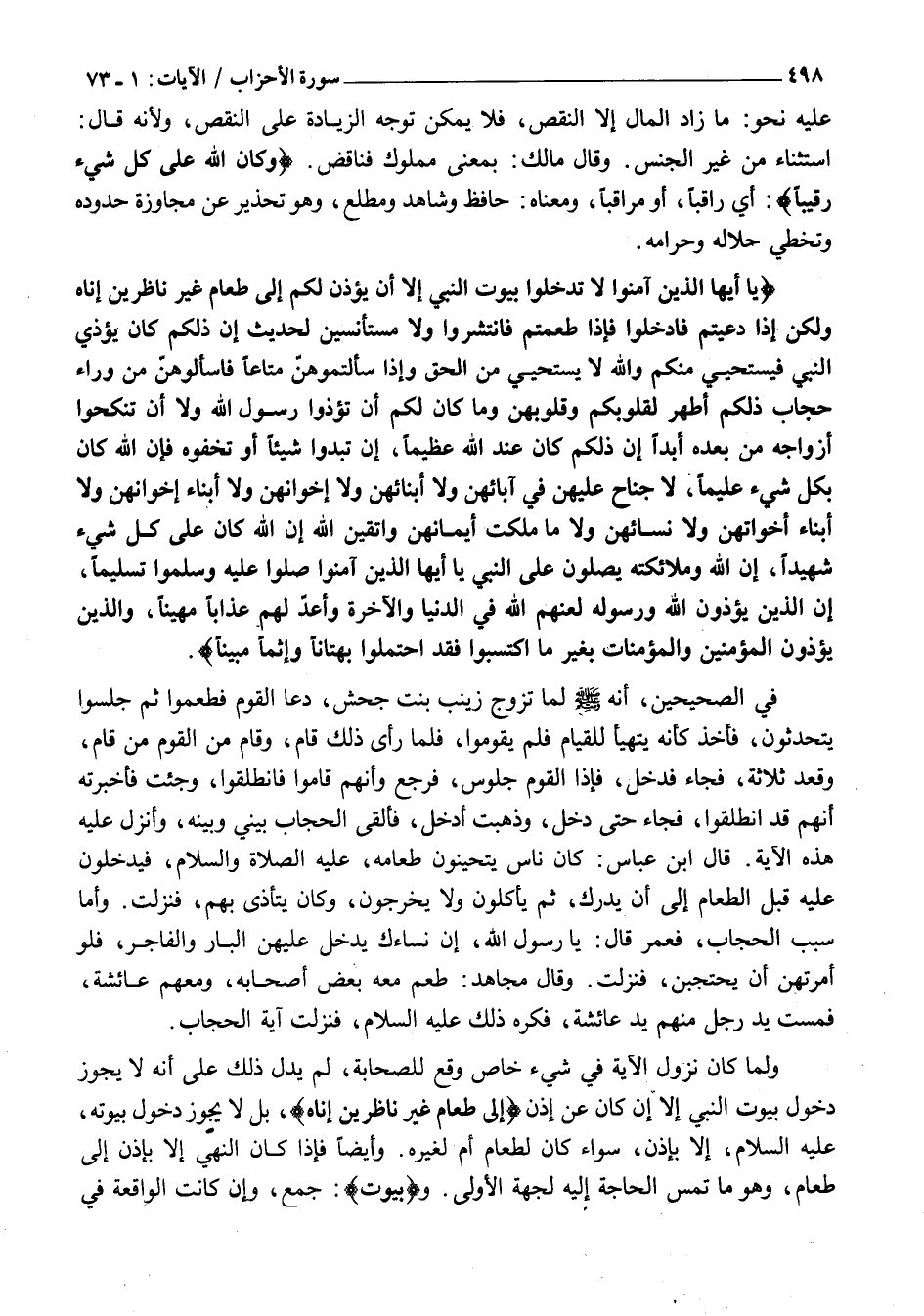 يَا أَيُّهَا الَّذِينَ آمَنُوا لَا تَدْخُلُوا بُيُوتَ النَّبِيِّ إِلَّا أَنْ يُؤْذَنَ لَكُمْ إِلى طَعامٍ غَيْرَ ناظِرِينَ إِناهُ وَلكِنْ إِذا دُعِيتُمْ فَادْخُلُوا فَإِذا طَعِمْتُمْ فَانْتَشِرُوا وَلا مُسْتَأْنِسِينَ لِحَدِيثٍ إِنَّ ذلِكُمْ كانَ يُؤْذِي النَّبِيَّ فَيَسْتَحْيِي مِنْكُمْ وَاللَّهُ لَا يَسْتَحْيِي مِنَ الْحَقِّ وَإِذا سَأَلْتُمُوهُنَّ مَتاعاً فَسْئَلُوهُنَّ مِنْ وَراءِ حِجابٍ ذلِكُمْ أَطْهَرُ لِقُلُوبِكُمْ وَقُلُوبِهِنَّ وَما كانَ لَكُمْ أَنْ تُؤْذُوا رَسُولَ اللَّهِ وَلا أَنْ تَنْكِحُوا أَزْواجَهُ مِنْ بَعْدِهِ أَبَداً إِنَّ ذلِكُمْ كانَ عِنْدَ اللَّهِ عَظِيماً، إِنْ تُبْدُوا شَيْئاً أَوْ تُخْفُوهُ فَإِنَّ اللَّهَ كانَ بِكُلِّ شَيْءٍ عَلِيماً، لَا جُناحَ عَلَيْهِنَّ فِي آبائِهِنَّ وَلا أَبْنائِهِنَّ وَلا إِخْوانِهِنَّ وَلا أَبْناءِ إِخْوانِهِنَّ وَلا أَبْناءِ أَخَواتِهِنَّ وَلا نِسائِهِنَّ وَلا مَا مَلَكَتْ أَيْمانُهُنَّ وَاتَّقِينَ اللَّهَ إِنَّ اللَّهَ كانَ عَلى كُلِّ شَيْءٍ شَهِيداً، إِنَّ اللَّهَ وَمَلائِكَتَهُ يُصَلُّونَ عَلَى النَّبِيِّ يَا أَيُّهَا الَّذِينَ آمَنُوا صَلُّوا عَلَيْهِ وَسَلِّمُوا تَسْلِيماً، إِنَّ الَّذِينَ يُؤْذُونَ اللَّهَ وَرَسُولَهُ لَعَنَهُمُ اللَّهُ فِي الدُّنْيا وَالْآخِرَةِ وَأَعَدَّ لَهُمْ عَذاباً مُهِيناً، وَالَّذِينَ يُؤْذُونَ الْمُؤْمِنِينَ وَالْمُؤْمِناتِ بِغَيْرِ مَا اكْتَسَبُوا فَقَدِ احْتَمَلُوا بُهْتاناً وَإِثْماً مُبِيناً.