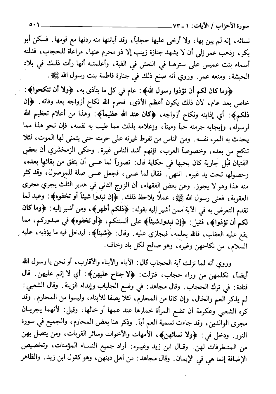 خَاصٌّ بَعْدَ عَامٍّ، لِأَنَّ ذَلِكَ يَكُونُ أَعْظَمَ الْأَذَى، فَحَرَّمَ اللَّهُ نِكَاحَ أَزْوَاجِهِ بَعْدَ وَفَاتِهِ. إِنَّ ذلِكُمْ: أَيْ إِذَايَتَهُ وَنِكَاحَ أَزْوَاجِهِ، كانَ عِنْدَ اللَّهِ عَظِيماً: وَهَذَا مِنْ إِعْلَامِ تَعْظِيمِ اللَّهِ لِرَسُولِهِ، وَإِيجَابِهِ حُرْمَتَهُ حَيًّا وَمَيِّتًا، وَإِعْلَامِهِ بِذَلِكَ مِمَّا طَيَّبَ بِهِ نَفْسَهُ، فَإِنَّ نَحْوَ هَذَا مِمَّا يُحَدِّثُ بِهِ الْمَرْءُ نَفْسَهُ. وَمِنَ النَّاسِ مَنْ تُفْرِطُ غَيْرَتُهُ عَلَى حُرْمَتِهِ حَتَّى يَتَمَنَّى لَهَا الْمَوْتَ، لِئَلَّا تُنْكَحَ مِنْ بَعْدِهِ، وَخُصُوصًا الْعَرَبَ، فَإِنَّهُمْ أَشَدُّ النَّاسِ غَيْرَةً. وَحَكَى الزَّمَخْشَرِيُّ أن بعض الفتيان قبّل جَارِيَةً كَانَ يُحِبُّهَا فِي حِكَايَةٍ قَالَ: تَصَوُّرًا لِمَا عَسَى أَنْ يَتَّفِقَ مِنْ بَقَائِهَا بَعْدَهُ، وَحُصُولِهَا تَحْتَ يَدِ غَيْرِهِ. انْتَهَى. فَقَالَ لِمَا عَسَى، فَجَعَلَ عَسَى صِلَةً لِلْمَوْصُولِ، وَقَدْ كَثُرَ مِنْهُ هَذَا وَهُوَ لَا يَجُوزُ. وَعَنْ بَعْضِ الْفُقَهَاءِ، أَنَّ الزَّوْجَ الثَّانِيَ فِي هَدِيرِ الثُّلُثِ يَجْرِي مَجْرَى الْعُقُوبَةِ، فَعَنَى رَسُولُ اللَّهِ صَلَّى اللَّهُ عَلَيْهِ وَسَلَّمَ، عَمَلًا يُلَاحِظُ ذَلِكَ. إِنْ تُبْدُوا شَيْئاً أَوْ تُخْفُوهُ: وَعِيدٌ لِمَا تَقَدَّمَ التَّعَرُّضُ بِهِ فِي الْآيَةِ مِمَّنْ أُشِيرَ إِلَيْهِ بِقَوْلِهِ: ذلِكُمْ أَطْهَرُ، وَمَنْ أُشِيرَ إِلَيْهِ: وَما كانَ لَكُمْ أَنْ تُؤْذُوا، فَقِيلَ: إِنْ تُبْدُوا شَيْئاً عَلَى أَلْسِنَتِكُمْ، أَوْ تُخْفُوهُ فِي صُدُورِكُمْ، مِمَّا يَقَعُ عَلَيْهِ الْعِقَابُ، فَاللَّهُ يَعْلَمُهُ، فَيُجَازِي عَلَيْهِ. وَقَالَ: شَيْئاً، لِيَدْخُلَ فِيهِ مَا يُؤْذِيهِ، عَلَيْهِ السَّلَامُ، مِنْ نِكَاحِهِنَّ وَغَيْرِهِ، وَهُوَ صَالِحٌ لِكُلِّ بَادٍ وَخَافٍ.