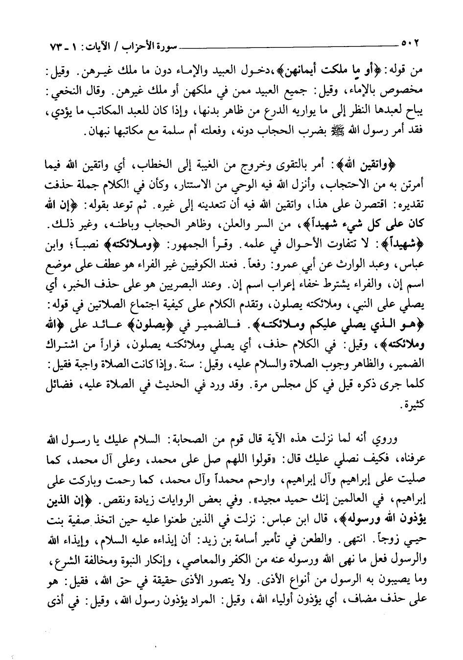 وَاتَّقِينَ اللَّهَ: أَمْرٌ بِالتَّقْوَى وَخُرُوجٌ مِنَ الْغَيْبَةِ إِلَى الْخِطَابِ، أَيْ وَاتَّقِينَ اللَّهَ فِيمَا أُمِرْتُنَّ بِهِ مِنَ الِاحْتِجَابِ، وَأَنْزَلَ اللَّهُ فِيهِ الْوَحْيَ مِنَ الِاسْتِتَارِ، وَكَأَنَّ فِي الْكَلَامِ جُمْلَةً حُذِفَتْ تَقْدِيرُهُ: اقْتَصِرْنَ عَلَى هَذَا، وَاتَّقِينَ اللَّهَ فِيهِ أَنْ تَتَعَدَّيْنَهُ إِلَى غَيْرِهِ. ثُمَّ تَوَعَّدَ بِقَوْلِهِ: إِنَّ اللَّهَ كانَ عَلى كُلِّ شَيْءٍ شَهِيداً، مِنَ السِّرِّ وَالْعَلَنِ، وَظَاهِرِ الْحِجَابِ وَبَاطِنِهِ، وَغَيْرِ ذَلِكَ.