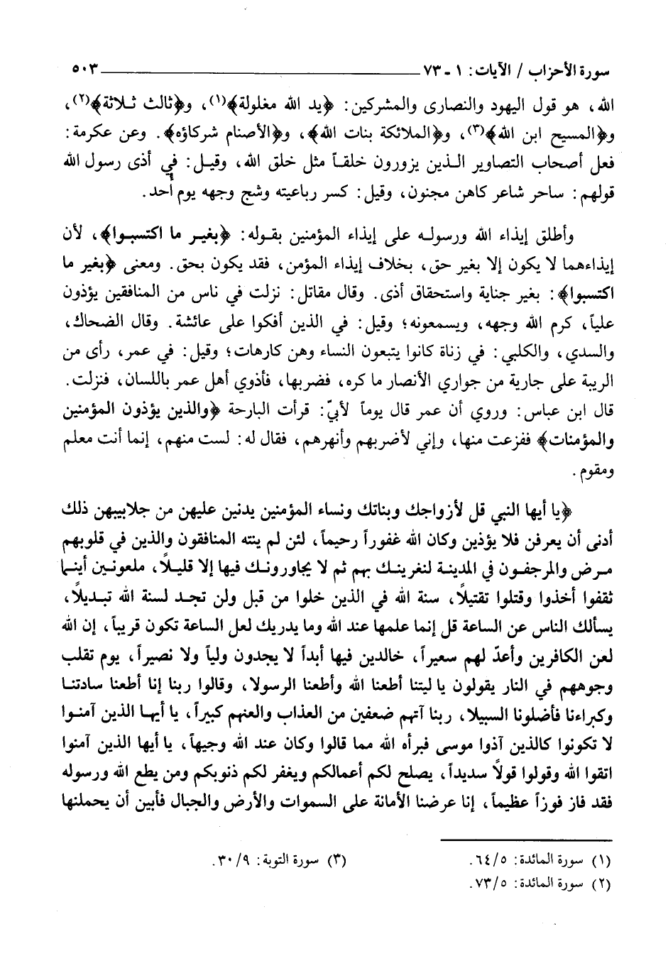 يَا أَيُّهَا النَّبِيُّ قُلْ لِأَزْواجِكَ وَبَناتِكَ وَنِساءِ الْمُؤْمِنِينَ يُدْنِينَ عَلَيْهِنَّ مِنْ جَلَابِيبِهِنَّ ذلِكَ أَدْنى أَنْ يُعْرَفْنَ فَلا يُؤْذَيْنَ وَكانَ اللَّهُ غَفُوراً رَحِيماً، لَئِنْ لَمْ يَنْتَهِ الْمُنافِقُونَ وَالَّذِينَ فِي قُلُوبِهِمْ مَرَضٌ وَالْمُرْجِفُونَ فِي الْمَدِينَةِ لَنُغْرِيَنَّكَ بِهِمْ ثُمَّ لَا يُجاوِرُونَكَ فِيها إِلَّا قَلِيلًا، مَلْعُونِينَ أَيْنَما ثُقِفُوا أُخِذُوا وَقُتِّلُوا تَقْتِيلًا، سُنَّةَ اللَّهِ فِي الَّذِينَ خَلَوْا مِنْ قَبْلُ وَلَنْ تَجِدَ لِسُنَّةِ اللَّهِ تَبْدِيلًا، يَسْئَلُكَ النَّاسُ عَنِ السَّاعَةِ قُلْ إِنَّما عِلْمُها عِنْدَ اللَّهِ وَما يُدْرِيكَ لَعَلَّ السَّاعَةَ تَكُونُ قَرِيباً، إِنَّ اللَّهَ لَعَنَ الْكافِرِينَ وَأَعَدَّ لَهُمْ سَعِيراً، خالِدِينَ فِيها أَبَداً لَا يَجِدُونَ وَلِيًّا وَلا نَصِيراً، يَوْمَ تُقَلَّبُ وُجُوهُهُمْ فِي النَّارِ يَقُولُونَ يَا لَيْتَنا أَطَعْنَا اللَّهَ وَأَطَعْنَا الرَّسُولَا، وَقالُوا رَبَّنا إِنَّا أَطَعْنا سادَتَنا وَكُبَراءَنا فَأَضَلُّونَا السَّبِيلَا، رَبَّنا آتِهِمْ ضِعْفَيْنِ مِنَ الْعَذابِ وَالْعَنْهُمْ لَعْناً كَبِيراً، يَا أَيُّهَا الَّذِينَ آمَنُوا لَا تَكُونُوا كَالَّذِينَ آذَوْا مُوسى فَبَرَّأَهُ اللَّهُ مِمَّا قالُوا وَكانَ عِنْدَ اللَّهِ وَجِيهاً، يَا أَيُّهَا الَّذِينَ آمَنُوا اتَّقُوا اللَّهَ وَقُولُوا قَوْلًا سَدِيداً، يُصْلِحْ لَكُمْ أَعْمالَكُمْ وَيَغْفِرْ لَكُمْ ذُنُوبَكُمْ وَمَنْ يُطِعِ اللَّهَ وَرَسُولَهُ فَقَدْ فازَ فَوْزاً عَظِيماً، إِنَّا عَرَضْنَا الْأَمانَةَ عَلَى السَّماواتِ وَالْأَرْضِ وَالْجِبالِ فَأَبَيْنَ أَنْ يَحْمِلْنَها