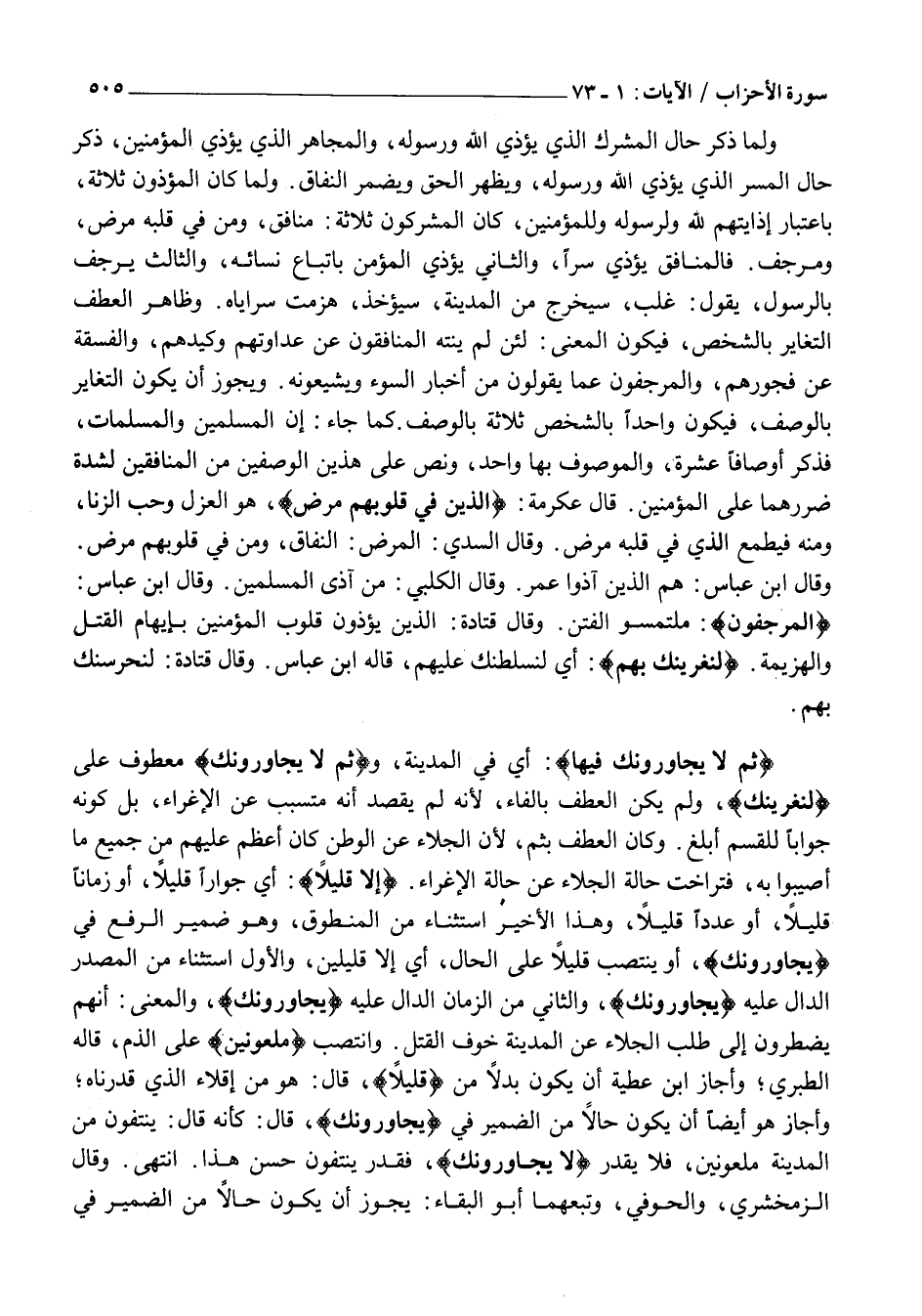 ثُمَّ لَا يُجاوِرُونَكَ فِيها: أَيْ فِي الْمَدِينَةِ، وثُمَّ لَا يُجاوِرُونَكَ مَعْطُوفٌ عَلَى لَنُغْرِيَنَّكَ، وَلَمْ يَكُنِ الْعَطْفُ بِالْفَاءِ، لِأَنَّهُ لَمْ يَقْصِدْ أَنَّهُ مُتَسَبِّبٌ عَنِ الْإِغْرَاءِ، بَلْ كَوْنُهُ جَوَابًا لِلْقَسَمِ أبلغ. وكان العطف بثم، لِأَنَّ الْجَلَاءَ عَنِ الْوَطَنِ كَانَ أَعْظَمَ عَلَيْهِمْ مِنْ جَمِيعِ مَا أُصِيبُوا بِهِ، فَتَرَاخَتْ حَالَةُ الْجَلَاءِ عَنْ حَالَةِ الْإِغْرَاءِ. إِلَّا قَلِيلًا: أَيْ جِوَارًا قَلِيلًا، أَوْ زَمَانًا قَلِيلًا، أَوْ عَدَدًا قَلِيلًا، وَهَذَا الْأَخِيرُ اسْتِثْنَاءٌ مِنَ الْمَنْطُوقِ، وَهُوَ ضَمِيرُ الرَّفْعِ فِي يُجاوِرُونَكَ، أَوْ يَنْتَصِبُ قَلِيلًا عَلَى الْحَالِ، أَيْ إِلَّا قَلِيلِينَ، وَالْأَوَّلُ اسْتِثْنَاءٌ مِنَ الْمَصْدَرِ الدَّالِّ عَلَيْهِ يُجاوِرُونَكَ، وَالثَّانِي مِنَ الزَّمَانِ الدَّالِّ عَلَيْهِ يُجاوِرُونَكَ، وَالْمَعْنَى: أَنَّهُمْ يُضْطَرُّونَ إِلَى طَلَبِ الْجَلَاءِ عَنِ الْمَدِينَةِ خَوْفَ الْقَتْلِ. وَانْتَصَبَ مَلْعُونِينَ عَلَى الذَّمِّ، قَالَهُ الطَّبَرِيُّ وَأَجَازَ ابْنُ عَطِيَّةَ أَنْ يَكُونَ بَدَلًا مِنْ قَلِيلًا، قَالَ: هُوَ مِنْ إِقْلَاءِ الَّذِي قَدَّرْنَاهُ وَأَجَازَ هُوَ أَيْضًا أَنْ يَكُونَ حَالًا مِنَ الضَّمِيرِ فِي يُجاوِرُونَكَ، قَالَ: كَأَنَّهُ قَالَ: يَنْتَفُونَ من المدينة ملعونين، فَلَا يُقَدِّرُ لَا يُجاوِرُونَكَ، فَقَدَّرَ يَنْتَفُونَ حَسَنٌ هَذَا. انْتَهَى. وَقَالَ الزَّمَخْشَرِيُّ، وَالْحَوْفِيُّ، وَتَبِعَهُمَا أَبُو الْبَقَاءِ: يَجُوزُ أَنْ يَكُونَ حَالًا مِنَ الضَّمِيرِ فِي