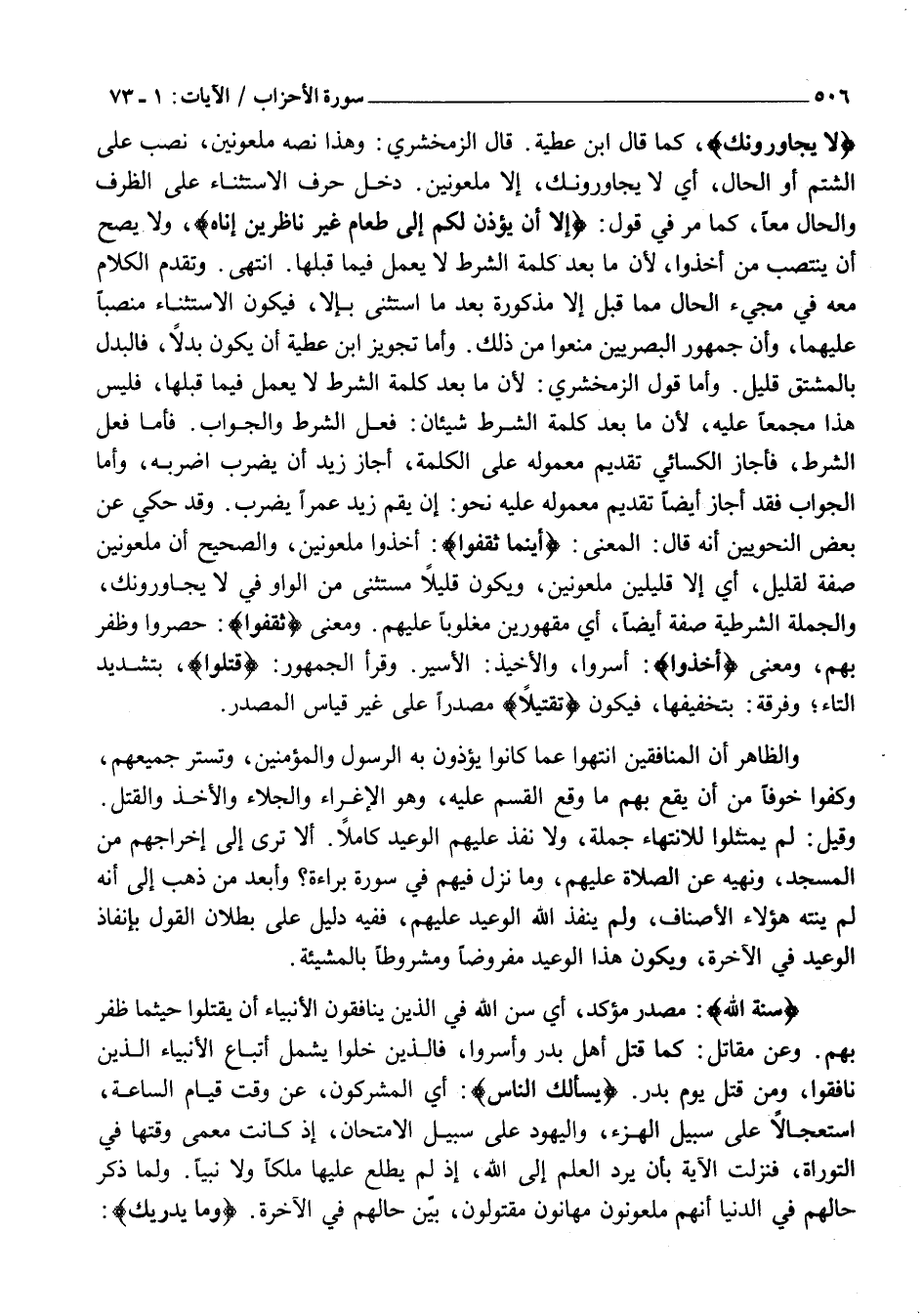 لَا يُجاوِرُونَكَ، كَمَا قَالَ ابْنُ عَطِيَّةَ. قَالَ الزَّمَخْشَرِيُّ: وَهَذَا نَصُّهُ مَلْعُونِينَ، نُصِبَ عَلَى الشَّتْمِ أَوِ الْحَالِ، أَيْ لَا يُجَاوِرُونَكَ، إِلَّا مَلْعُونِينَ. دَخَلَ حَرْفُ الِاسْتِثْنَاءِ عَلَى الظَّرْفِ وَالْحَالِ مَعًا، كَمَا مَرَّ فِي قَوْلِ: إِلَّا أَنْ يُؤْذَنَ لَكُمْ إِلى طَعامٍ غَيْرَ ناظِرِينَ إِناهُ، وَلَا يَصِحُّ أَنْ يَنْتَصِبَ مِنْ أُخِذُوا، لِأَنَّ مَا بَعْدَ كَلِمَةِ الشَّرْطِ لَا يَعْمَلُ فِيمَا قَبْلَهَا. انْتَهَى. وَتَقَدَّمَ الْكَلَامُ مَعَهُ فِي مَجِيءِ الْحَالِ مِمَّا قبل إلا مذكورة بعد ما اسْتَثْنَى بِإِلَّا، فَيَكُونُ الِاسْتِثْنَاءُ مُنْصَبًّا عَلَيْهِمَا، وَأَنَّ جُمْهُورَ الْبَصْرِيِّينَ مَنَعُوا مِنْ ذَلِكَ. وَأَمَّا تَجْوِيزُ ابْنُ عَطِيَّةَ أَنْ يَكُونَ بَدَلًا، فَالْبَدَلُ بِالْمُشْتَقِّ قَلِيلٌ. وَأَمَّا قَوْلُ الزَّمَخْشَرِيِّ: لِأَنَّ مَا بَعْدَ كَلِمَةِ الشَّرْطِ لَا يَعْمَلُ فِيمَا قَبْلَهَا، فَلَيْسَ هَذَا مُجْمَعًا عَلَيْهِ، لِأَنَّ مَا بَعْدَ كَلِمَةِ الشَّرْطِ شَيْئَانِ: فِعْلُ الشَّرْطِ وَالْجَوَابُ. فَأَمَّا فِعْلُ الشَّرْطِ، فَأَجَازَ الْكِسَائِيُّ تَقْدِيمَ مَعْمُولِهِ عَلَى الْكَلِمَةِ، أَجَازَ زَيْدٌ أَنْ يَضْرِبَ اضْرِبْهُ، وَأَمَّا الْجَوَابُ فَقَدْ أَجَازَ أَيْضًا تَقْدِيمَ مَعْمُولِهِ عَلَيْهِ نَحْوُ: إِنْ يُقِمْ زَيْدٌ عَمْرًا يُضْرَبْ. وَقَدْ حُكِيَ عَنْ بَعْضِ النَّحْوِيِّينَ أَنَّهُ قَالَ: الْمَعْنَى: أَيْنَما ثُقِفُوا: أُخِذُوا مَلْعُونِينَ، وَالصَّحِيحُ أَنَّ مَلْعُونِينَ صِفَةً لِقَلِيلٍ، أَيْ إِلَّا قَلِيلِينَ مَلْعُونِينَ، وَيَكُونُ قَلِيلًا مُسْتَثْنًى مِنَ الْوَاوِ فِي لَا يُجَاوِرُونَكَ، وَالْجُمْلَةُ الشَّرْطِيَّةُ صِفَةٌ أَيْضًا، أَيْ مَقْهُورِينَ مَغْلُوبًا عَلَيْهِمْ. وَمَعْنَى ثُقِفُوا: حُصِرُوا وَظَفِرَ بِهِمْ، وَمَعْنَى أُخِذُوا: أُسِرُوا، وَالْأَخِيذُ: الْأَسِيرُ. وَقَرَأَ الْجُمْهُورُ: قُتِّلُوا، بِتَشْدِيدِ التَّاءِ وَفِرْقَةٌ: بِتَخْفِيفِهَا، فَيَكُونُ تَقْتِيلًا مَصْدَرًا عَلَى غَيْرِ قِيَاسِ الْمَصْدَرِ.