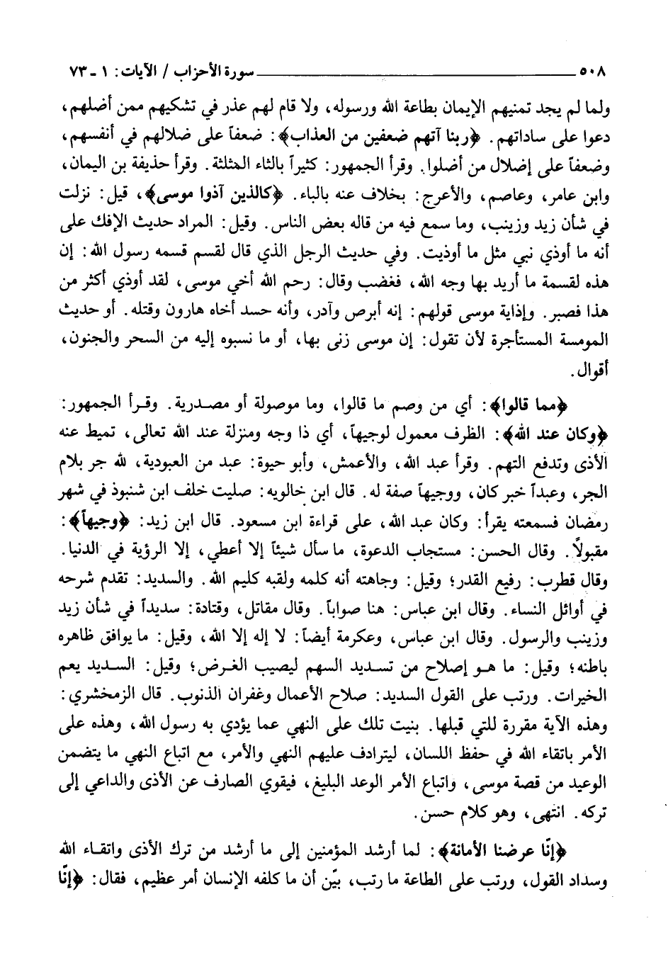 وَقَالَ قُطْرُبٌ: رَفِيعَ الْقَدْرِ وَقِيلَ: وَجَاهَتُهُ أَنَّهُ كَلَّمَهُ وَلَقَّبَهُ كَلِيمَ اللَّهِ. وَالسَّدِيدُ: تَقَدَّمَ شَرْحُهُ فِي أَوَائِلِ النِّسَاءِ. وَقَالَ ابْنُ عَبَّاسٍ: هُنَا صَوَابًا. وَقَالَ مُقَاتِلٌ، وَقَتَادَةُ: سَدِيدًا فِي شَأْنِ زَيْدٍ وَزَيْنَبَ وَالرَّسُولِ. وَقَالَ ابْنُ عَبَّاسٍ، وَعِكْرِمَةُ أَيْضًا: لَا إِلَهَ إِلَّا اللَّهُ، وَقِيلَ: مَا يُوَافِقُ ظَاهِرُهُ بَاطِنَهُ وَقِيلَ: مَا هُوَ إِصْلَاحٌ مِنْ تَسْدِيدِ السَّهْمِ لِيُصِيبَ الْغَرَضَ وَقِيلَ: السَّدِيدُ يَعُمُّ الْخَيْرَاتِ. وَرُتِّبَ عَلَى الْقَوْلِ السَّدِيدِ: صَلَاحُ الْأَعْمَالِ وَغُفْرَانُ الذُّنُوبِ. قَالَ الزَّمَخْشَرِيُّ: