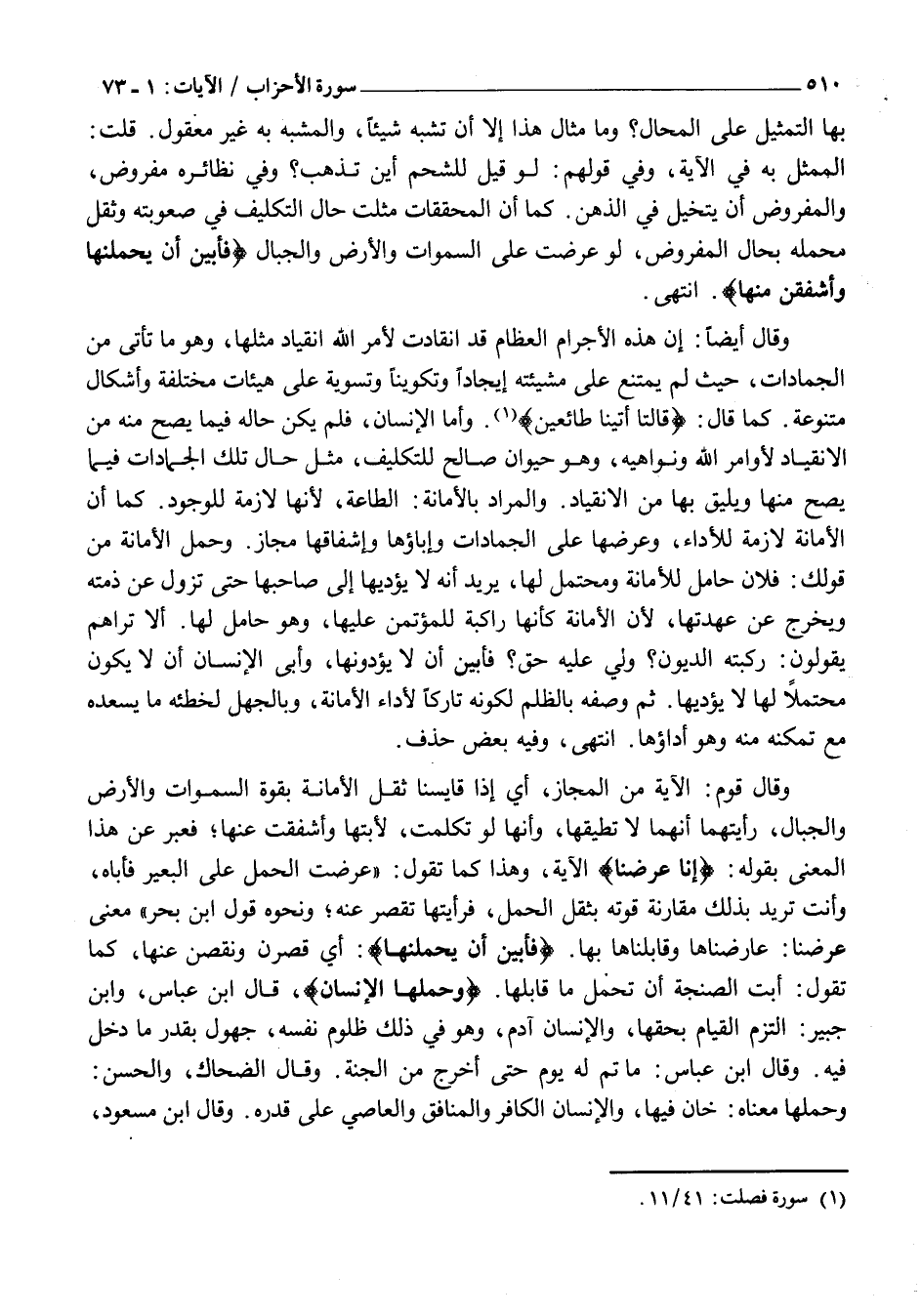وَقَالَ أَيْضًا: إِنَّ هَذِهِ الْأَجْرَامَ الْعِظَامَ قَدِ انْقَادَتْ لِأَمْرِ اللَّهِ انْقِيَادَ مِثْلِهَا، وَهُوَ مَا تَأْتِي مِنَ الْجَمَادَاتِ، حَيْثُ لَمْ يَمْتَنِعْ عَلَى مَشِيئَتِهِ إِيجَادًا وَتَكْوِينًا وَتَسْوِيَةً عَلَى هَيْئَاتٍ مُخْتَلِفَةٍ وَأَشْكَالٍ مُتَنَوِّعَةٍ. كَمَا قَالَ: قالَتا أَتَيْنا طائِعِينَ «1» . وَأَمَّا الْإِنْسَانُ، فَلَمْ يَكُنْ حَالُهُ فِيمَا يَصِحُّ مِنْهُ مِنَ الِانْقِيَادِ لِأَوَامِرِ اللَّهِ وَنَوَاهِيهِ، وَهُوَ حَيَوَانٌ صَالِحٌ لِلتَّكْلِيفِ، مِثْلَ حَالِ تِلْكَ الْجَمَادَاتِ فِيمَا يَصِحُّ مِنْهَا وَيَلِيقُ بِهَا مِنَ الِانْقِيَادِ. وَالْمُرَادُ بِالْأَمَانَةِ: الطَّاعَةُ، لِأَنَّهَا لَازِمَةٌ لِلْوُجُودِ. كَمَا أَنَّ الْأَمَانَةَ لَازِمَةٌ لِلْأَدَاءِ، وَعَرْضُهَا عَلَى الْجَمَادَاتِ وَإِبَاؤُهَا وَإِشْفَاقُهَا مَجَازٌ. وَحَمْلُ الْأَمَانَةِ مِنْ قَوْلِكَ: فُلَانٌ حَامِلٌ لِلْأَمَانَةِ وَمُحْتَمِلٌ لَهَا، يُرِيدُ أَنَّهُ لَا يُؤَدِّيهَا إِلَى صَاحِبِهَا حَتَّى تَزُولَ عَنْ ذِمَّتِهِ وَيَخْرُجَ عَنْ عُهْدَتِهَا، لِأَنَّ الْأَمَانَةَ كَأَنَّهَا رَاكِبَةٌ لِلْمُؤْتَمَنِ عَلَيْهَا، وَهُوَ حَامِلٌ لَهَا. أَلَا تَرَاهُمْ يَقُولُونَ: رَكِبَتْهُ الدُّيُونُ؟ وَلِي عَلَيْهِ حَقٌّ؟ فَأَبَيْنَ أَنْ لَا يُؤَدُّونَهَا، وَأَبَى الْإِنْسَانُ أَنْ لَا يَكُونَ مُحْتَمِلًا لَهَا لَا يُؤَدِّيهَا. ثُمَّ وَصَفَهُ بِالظُّلْمِ لِكَوْنِهِ تَارِكًا لِأَدَاءِ الْأَمَانَةِ، وَبِالْجَهْلِ لِخَطَئِهِ مَا يُسْعِدُهُ مَعَ تَمَكُّنِهِ مِنْهُ وَهُوَ أَدَاؤُهَا. انْتَهَى، وَفِيهِ بَعْضُ حَذْفٍ.