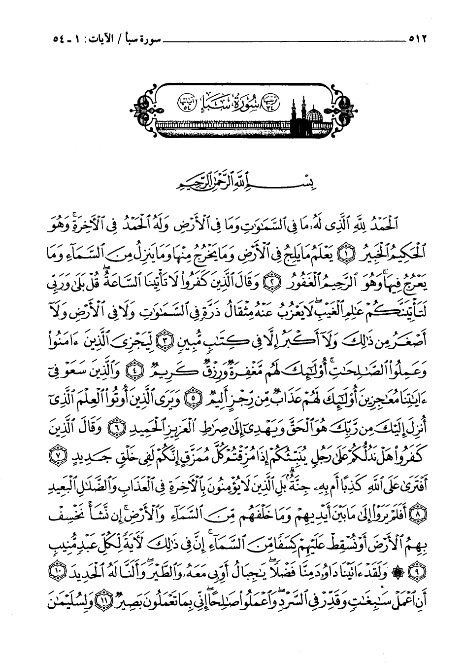 الْحَمْدُ لِلَّهِ الَّذِي لَهُ مَا فِي السَّماواتِ وَما فِي الْأَرْضِ وَلَهُ الْحَمْدُ فِي الْآخِرَةِ وَهُوَ الْحَكِيمُ الْخَبِيرُ (1) يَعْلَمُ مَا يَلِجُ فِي الْأَرْضِ وَما يَخْرُجُ مِنْها وَما يَنْزِلُ مِنَ السَّماءِ وَما يَعْرُجُ فِيها وَهُوَ الرَّحِيمُ الْغَفُورُ (2) وَقالَ الَّذِينَ كَفَرُوا لَا تَأْتِينَا السَّاعَةُ قُلْ بَلى وَرَبِّي لَتَأْتِيَنَّكُمْ عالِمِ الْغَيْبِ لَا يَعْزُبُ عَنْهُ مِثْقالُ ذَرَّةٍ فِي السَّماواتِ وَلا فِي الْأَرْضِ وَلا أَصْغَرُ مِنْ ذلِكَ وَلا أَكْبَرُ إِلاَّ فِي كِتابٍ مُبِينٍ (3) لِيَجْزِيَ الَّذِينَ آمَنُوا وَعَمِلُوا الصَّالِحاتِ أُولئِكَ لَهُمْ مَغْفِرَةٌ وَرِزْقٌ كَرِيمٌ (4)