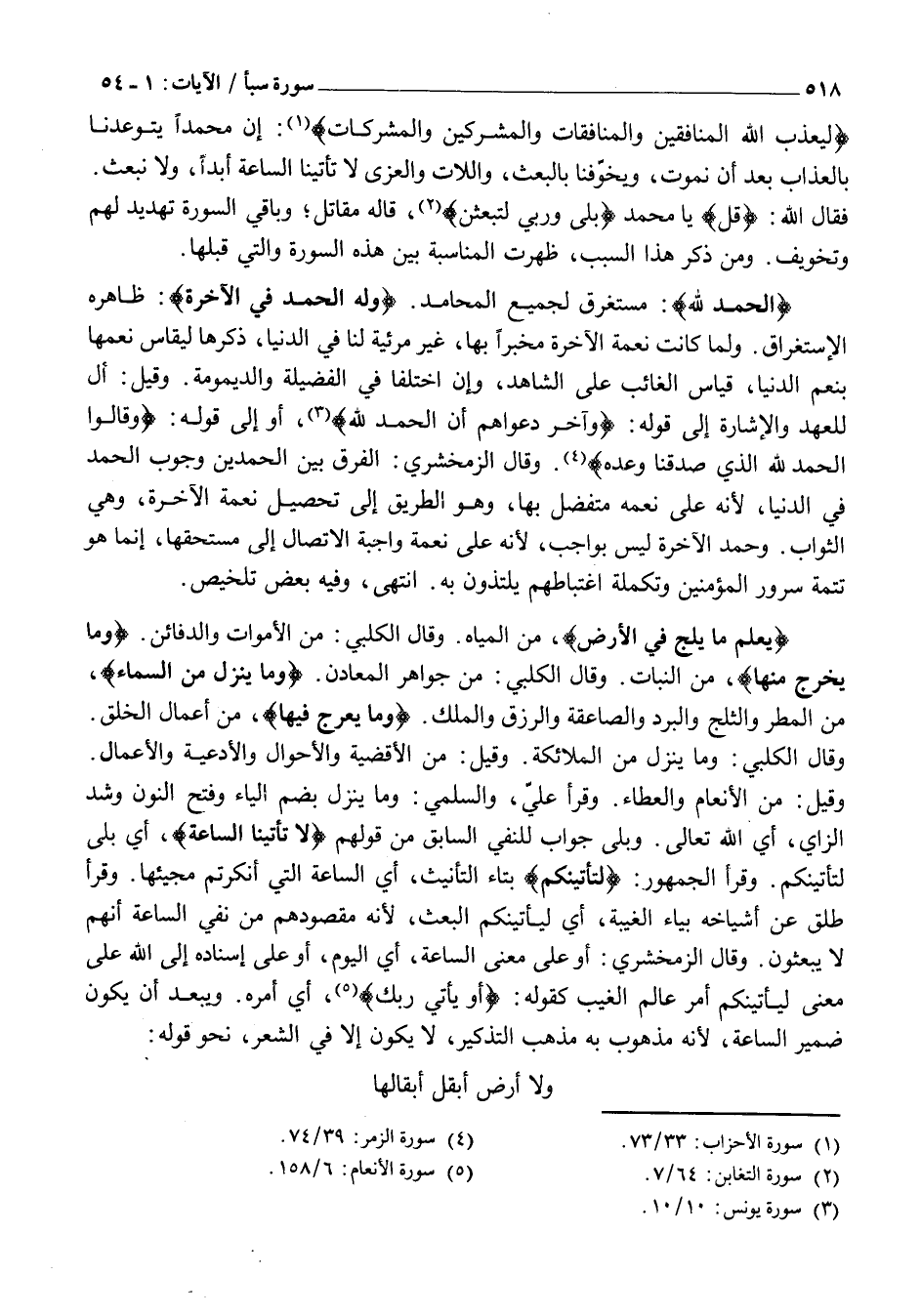 الْحَمْدُ لِلَّهِ: مُسْتَغْرِقٌ لِجَمِيعِ الْمَحَامِدِ. وَلَهُ الْحَمْدُ فِي الْآخِرَةِ: ظَاهِرُهُ الِاسْتِغْرَاقُ. وَلَمَّا كَانَتْ نِعْمَةُ الْآخِرَةِ مُخْبَرًا بِهَا، غَيْرَ مَرْئِيَّةٍ لَنَا فِي الدُّنْيَا، ذَكَرَهَا لِيُقَاسَ نِعَمُهَا بِنِعَمِ الدُّنْيَا، قِيَاسَ الْغَائِبِ عَلَى الشَّاهِدِ، وَإِنِ اخْتَلَفَا فِي الْفَضِيلَةِ وَالدَّيْمُومَةِ. وَقِيلَ: أَلْ لِلْعَهْدِ وَالْإِشَارَةِ إِلَى قَوْلِهِ: وَآخِرُ دَعْواهُمْ أَنِ الْحَمْدُ لِلَّهِ «3» ، أَوْ إِلَى قَوْلِهِ: وَقالُوا الْحَمْدُ لِلَّهِ الَّذِي صَدَقَنا وَعْدَهُ «4» . وَقَالَ الزَّمَخْشَرِيُّ: الْفَرْقُ بَيْنَ الْحَمْدَيْنِ وُجُوبُ الْحَمْدِ فِي الدُّنْيَا، لِأَنَّهُ عَلَى نِعَمِهِ مُتَفَضِّلٌ بِهَا، وَهُوَ الطَّرِيقُ إِلَى تَحْصِيلِ نِعْمَةِ الْآخِرَةِ، وَهِيَ الثَّوَابُ. وَحَمْدُ الْآخِرَةِ لَيْسَ بِوَاجِبٍ، لِأَنَّهُ عَلَى نِعْمَةٍ وَاجِبَةِ الِاتِّصَالُ إِلَى مُسْتَحِقِّهَا، إِنَّمَا هُوَ تَتِمَّةُ سُرُورِ الْمُؤْمِنِينَ وَتَكْمِلَةُ اغْتِبَاطِهِمْ يَلْتَذُّونَ بِهِ. انْتَهَى، وَفِيهِ بَعْضُ تَلْخِيصٍ.