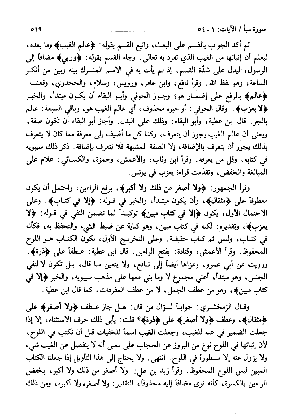 عالِمِ بِالرَّفْعِ عَلَى إِضْمَارِ هُوَ وَجَوَّزَ الْحَوْفِيُّ وَأَبُو الْبَقَاءِ أَنْ يَكُونَ مُبْتَدَأً، وَالْخَبَرُ لَا يَعْزُبُ. وَقَالَ الْحَوْفِيُّ: أَوْ خَبَرُهُ مَحْذُوفٌ، أَيْ عَالِمُ الْغَيْبِ هُوَ، وَبَاقِي السَّبْعَةِ: عَالِمِ بِالْجَرِّ. قَالَ ابْنُ عَطِيَّةَ، وَأَبُو الْبَقَاءِ: وَذَلِكَ عَلَى الْبَدَلِ. وَأَجَازَ أَبُو الْبَقَاءِ أَنْ تَكُونَ صِفَةً، وَيَعْنِي أَنَّ عَالِمَ الْغَيْبِ يَجُوزُ أَنْ يَتَعَرَّفَ، وَكَذَا كُلُّ مَا أُضِيفَ إِلَى مَعْرِفَةٍ مِمَّا كَانَ لَا يَتَعَرَّفُ بِذَلِكَ يَجُوزُ أَنْ يَتَعَرَّفَ بِالْإِضَافَةِ، إِلَّا الصِّفَةَ الْمُشَبَّهَةَ فَلَا تَتَعَرَّفُ بِإِضَافَةٍ. ذَكَرَ ذَلِكَ سِيبَوَيْهِ فِي كِتَابِهِ، وَقَلَّ مَنْ يَعْرِفُهُ. وَقَرَأَ ابْنُ وَثَّابٍ، وَالْأَعْمَشُ، وَحَمْزَةُ، وَالْكِسَائِيُّ: عَلَّامِ عَلَى الْمُبَالَغَةِ وَالْخَفْضِ، وَتَقَدَّمَتْ قِرَاءَةُ يَعْزُبُ فِي يُونُسَ.
