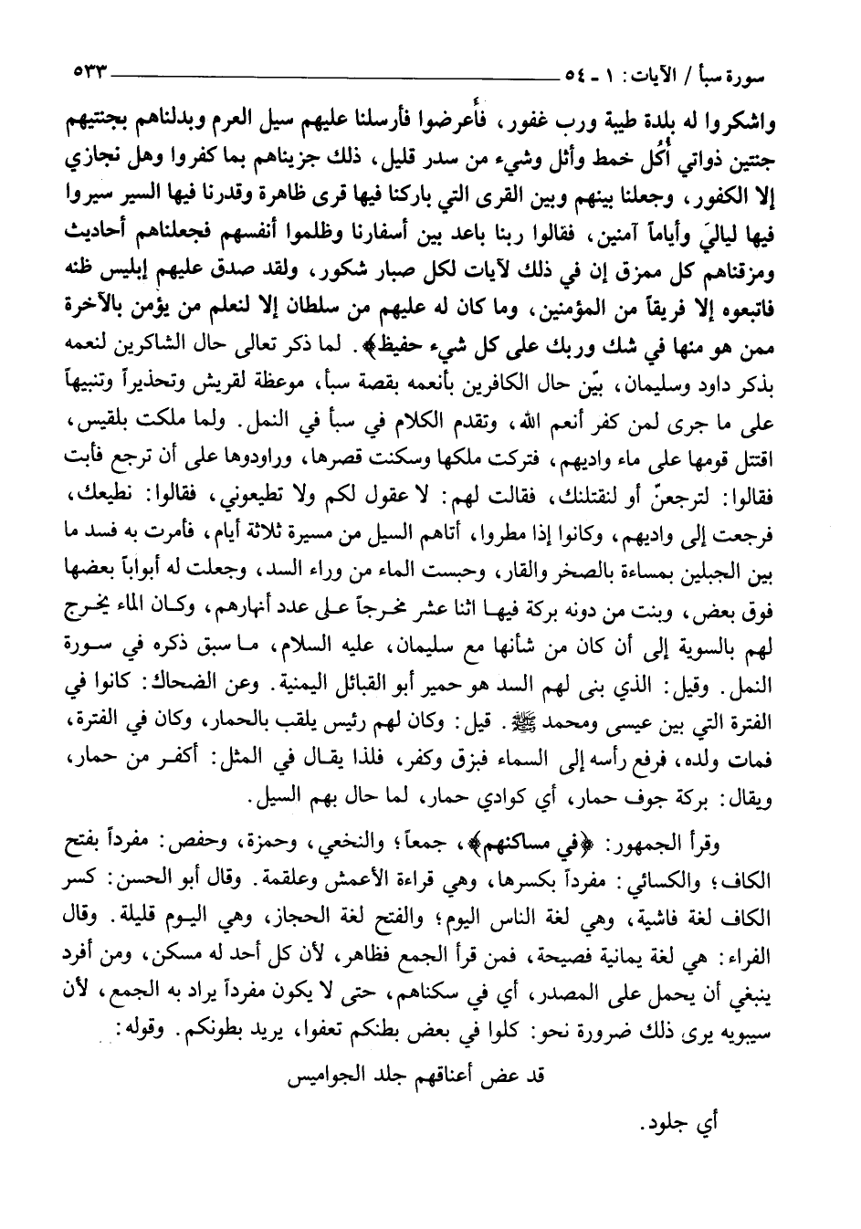 وَاشْكُرُوا لَهُ بَلْدَةٌ طَيِّبَةٌ وَرَبٌّ غَفُورٌ، فَأَعْرَضُوا فَأَرْسَلْنا عَلَيْهِمْ سَيْلَ الْعَرِمِ وَبَدَّلْناهُمْ بِجَنَّتَيْهِمْ جَنَّتَيْنِ ذَواتَيْ أُكُلٍ خَمْطٍ وَأَثْلٍ وَشَيْءٍ مِنْ سِدْرٍ قَلِيلٍ، ذلِكَ جَزَيْناهُمْ بِما كَفَرُوا وَهَلْ نُجازِي إِلَّا الْكَفُورَ، وَجَعَلْنا بَيْنَهُمْ وَبَيْنَ الْقُرَى الَّتِي بارَكْنا فِيها قُرىً ظاهِرَةً وَقَدَّرْنا فِيهَا السَّيْرَ سِيرُوا فِيها لَيالِيَ وَأَيَّاماً آمِنِينَ، فَقالُوا رَبَّنا باعِدْ بَيْنَ أَسْفارِنا وَظَلَمُوا أَنْفُسَهُمْ فَجَعَلْناهُمْ أَحادِيثَ وَمَزَّقْناهُمْ كُلَّ مُمَزَّقٍ إِنَّ فِي ذلِكَ لَآياتٍ لِكُلِّ صَبَّارٍ شَكُورٍ، وَلَقَدْ صَدَّقَ عَلَيْهِمْ إِبْلِيسُ ظَنَّهُ فَاتَّبَعُوهُ إِلَّا فَرِيقاً مِنَ الْمُؤْمِنِينَ، وَما كانَ لَهُ عَلَيْهِمْ مِنْ سُلْطانٍ إِلَّا لِنَعْلَمَ مَنْ يُؤْمِنُ بِالْآخِرَةِ مِمَّنْ هُوَ مِنْها فِي شَكٍّ وَرَبُّكَ عَلى كُلِّ شَيْءٍ حَفِيظٌ