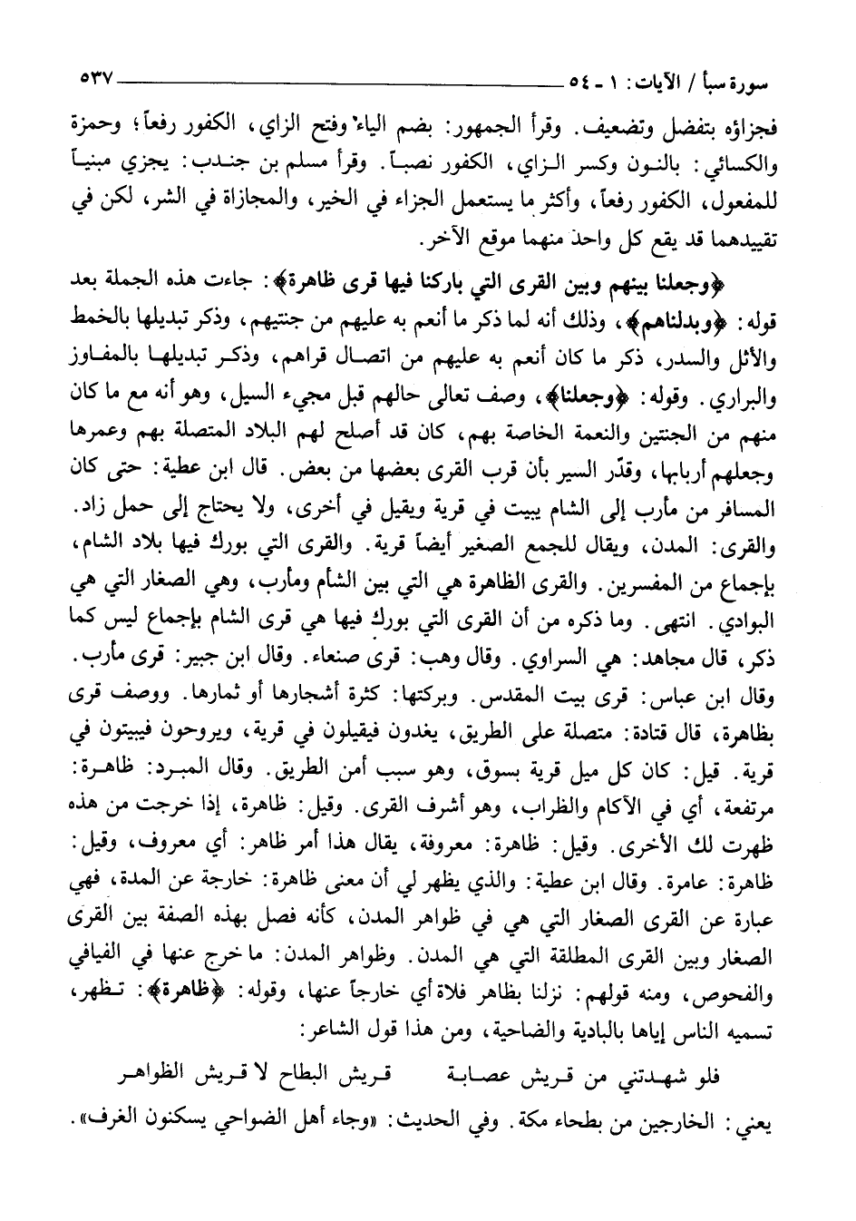 وَالْقُرَى: الْمُدُنُ، وَيُقَالُ لِلْجَمْعِ الصَّغِيرِ أَيْضًا قَرْيَةٌ. وَالْقُرَى الَّتِي بُورِكَ فِيهَا بِلَادُ الشَّامِ، بِإِجْمَاعٍ مِنَ الْمُفَسِّرِينَ. وَالْقُرَى الظَّاهِرَةُ هِيَ الَّتِي بَيْنَ الشَّامِ وَمَأْرِبَ، وَهِيَ الصِّغَارُ الَّتِي هِيَ الْبَوَادِي. انْتَهَى. وَمَا ذَكَرَهُ مِنْ أَنَّ الْقُرَى الَّتِي بُورِكَ فِيهَا هِيَ قُرَى الشَّامِ بِإِجْمَاعٍ لَيْسَ كَمَا ذَكَرَ، قَالَ مُجَاهِدٌ: هِيَ السَّرَاوَى. وَقَالَ وَهْبٌ: قُرَى صَنْعَاءَ. وَقَالَ ابْنُ جُبَيْرٍ: قُرَى مَأْرِبَ.