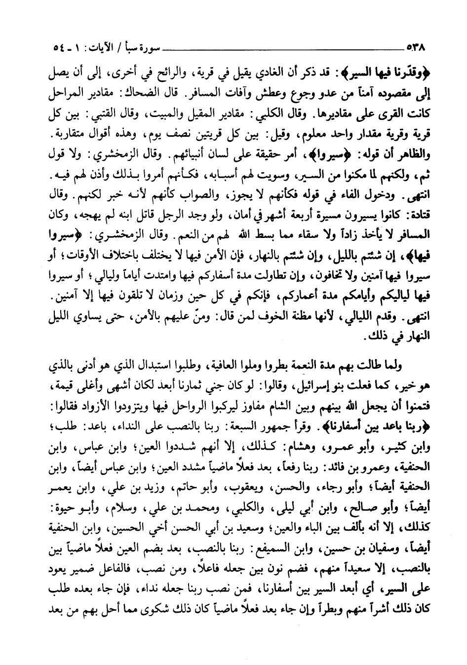 انْتَهَى. وَدُخُولُ الْفَاءِ فِي قَوْلِهِ فَكَأَنَّهُمْ لَا يَجُوزُ، وَالصَّوَابُ كَأَنَّهُمْ لِأَنَّهُ خَبَرُ لَكِنَّهُمْ. وَقَالَ قَتَادَةُ: كَانُوا يَسِيرُونَ مَسِيرَةَ أَرْبَعَةِ أَشْهُرٍ فِي أَمَانٍ، وَلَوْ وَجَدَ الرَّجُلُ قَاتِلَ ابْنِهِ لَمْ يُهِجْهُ، وَكَانَ الْمُسَافِرُ لَا يَأْخُذُ زَادًا وَلَا سِقَاءً مِمَّا بَسَطَ اللَّهُ لَهُمْ مِنَ النِّعَمِ. وَقَالَ الزَّمَخْشَرِيُّ: سِيرُوا فِيها، إِنْ شِئْتُمْ بِاللَّيْلِ، وَإِنْ شِئْتُمْ بِالنَّهَارِ، فَإِنَّ الْأَمْنَ فِيهَا لَا يَخْتَلِفُ بِاخْتِلَافِ الْأَوْقَاتِ أَوْ سِيرُوا فِيهَا آمِنِينَ وَلَا تَخَافُونَ، وَإِنْ تَطَاوَلَتْ مُدَّةُ أَسْفَارِكُمْ فِيهَا وَامْتَدَّتْ أَيَّامًا وَلَيَالِيَ أَوْ سِيرُوا فِيهَا لَيَالِيَكُمْ وَأَيَّامَكُمْ مُدَّةَ أَعْمَارِكُمْ، فَإِنَّكُمْ فِي كُلِّ حِينٍ وَزَمَانٍ لَا تُلْقُونَ فِيهَا إِلَّا آمَنِينَ.