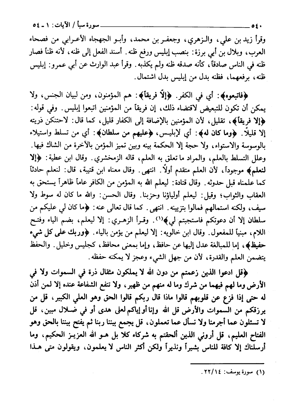 وَجَعْفَرُ بْنُ مُحَمَّدٍ، وَأَبُو الْجَهْجَاهِ الْأَعْرَابِيُّ مِنْ فُصَحَاءِ الْعَرَبِ، وَبِلَالُ بْنُ أَبِي بَرْزَةَ: بِنَصْبِ إِبْلِيسَ وَرَفْعِ ظَنَّهُ.