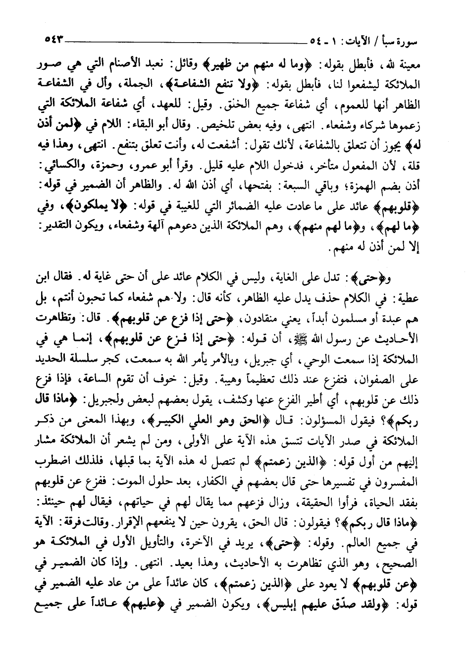 وحَتَّى: تَدُلُّ عَلَى الْغَايَةِ، وَلَيْسَ فِي الْكَلَامِ عَائِدٌ عَلَى أَنَّ حَتَّى غَايَةٌ لَهُ. فَقَالَ ابْنُ عَطِيَّةَ: فِي الْكَلَامِ حَذْفٌ يَدُلُّ عَلَيْهِ الظَّاهِرُ، كَأَنَّهُ قَالَ: وَلَا هُمْ شُفَعَاءُ كَمَا تُحِبُّونَ أَنْتُمْ، بَلْ هُمْ عَبْدَةٌ أَوْ مُسْلِمُونَ أَبَدًا، يَعْنِي مُنْقَادُونَ، حَتَّى إِذا فُزِّعَ عَنْ قُلُوبِهِمْ. قَالَ: وَتَظَاهَرَتِ