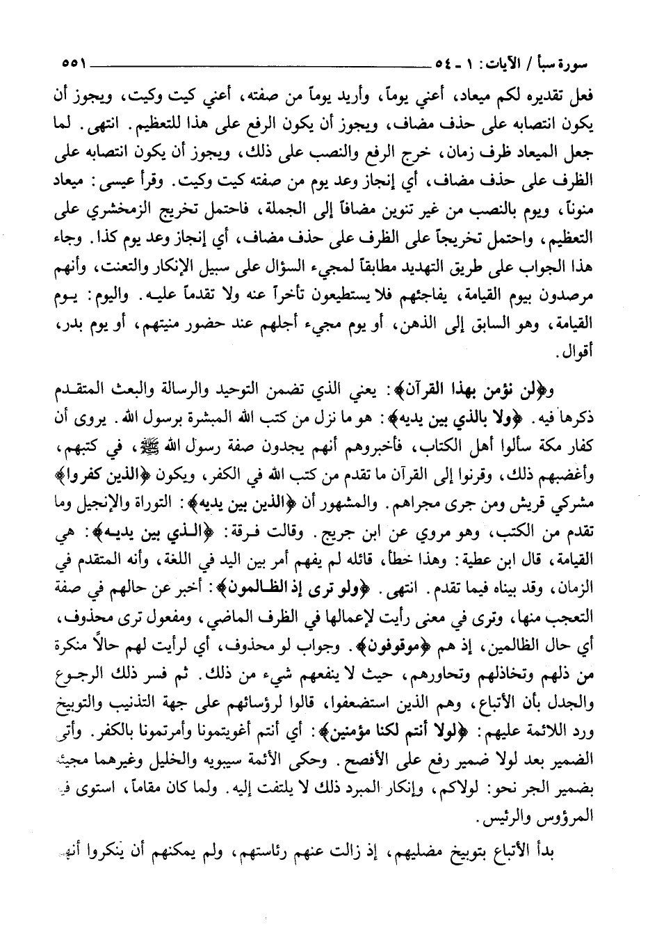 ، وَيَكُونُ الَّذِينَ كَفَرُوا مُشْرِكِي قُرَيْشٍ وَمَنْ جَرَى مَجْرَاهُمْ. وَالْمَشْهُورُ أَنَّ بِالَّذِي بَيْنَ يَدَيْهِ: التَّوْرَاةُ وَالْإِنْجِيلُ وَمَا تَقَدَّمَ مِنَ الْكُتُبِ، وَهُوَ مَرْوِيٌّ عَنِ ابْنِ جُرَيْجٍ. وقالت فرقة: بِالَّذِي بَيْنَ يَدَيْهِ: هِيَ الْقِيَامَةِ، قَالَ ابْنُ عَطِيَّةَ: وَهَذَا خَطَأٌ، قَائِلُهُ لَمْ يَفْهَمْ أَمْرَ بَيْنِ الْيَدِ فِي اللُّغَةِ، وَأَنَّهُ الْمُتَقَدِّمُ فِي الزَّمَانِ، وَقَدْ بَيَّنَاهُ فِيمَا تَقَدَّمَ. انْتَهَى. وَلَوْ تَرى إِذِ الظَّالِمُونَ: أَخْبَرَ عَنْ حَالِهِمْ فِي صِفَةِ التَّعَجُّبِ مِنْهَا، وَتَرَى فِي مَعْنَى رَأَيْتَ لِإِعْمَالِهَا فِي الظَّرْفِ الْمَاضِي، وَمَفْعُولُ تَرَى مَحْذُوفٌ، أَيْ حَالَ الظَّالِمِينَ، إِذْ هُمْ مَوْقُوفُونَ. وَجَوَابُ لَوْ مَحْذُوفٌ، أَيْ لَرَأَيْتَ لَهُمْ حَالًا مُنْكَرَةً مِنْ ذُلِّهِمْ وَتَخَاذُلِهِمْ وَتَحَاوُرِهِمْ، حَيْثُ لَا يَنْفَعُهُمْ شَيْءٌ مِنْ ذَلِكَ. ثُمَّ فَسَّرَ ذَلِكَ الرُّجُوعَ وَالْجَدَلَ بِأَنَّ الْأَتْبَاعَ، وَهُمُ الَّذِينَ اسْتُضْعِفُوا، قَالُوا لِرُؤَسَائِهِمْ عَلَى جِهَةِ التَّذْنِيبِ وَالتَّوْبِيخِ وَرَدِّ اللَّائِمَةِ عَلَيْهِمْ: لَوْلا أَنْتُمْ لَكُنَّا مُؤْمِنِينَ: أَيْ أَنْتُمْ أَغْوَيْتُمُونَا وَأَمَرْتُمُونَا بِالْكُفْرِ. وَأَتَى الضَّمِيرُ بَعْدَ لَوْلَا ضَمِيرُ رَفْعٍ عَلَى الْأَفْصَحِ. وَحَكَى الْأَئِمَّةُ سِيبَوَيْهِ وَالْخَلِيلُ وَغَيْرُهُمَا مَجِيئَهُ بِضَمِيرِ الْجَرِّ نَحْوُ: لَوْلَاكُمْ، وَإِنْكَارُ الْمُبَرِّدِ ذَلِكَ لَا يُلْتَفَتُ إِلَيْهِ. وَلَمَّا كَانَ مَقَامًا، اسْتَوَى فيه المرءوس وَالرَّئِيسُ.