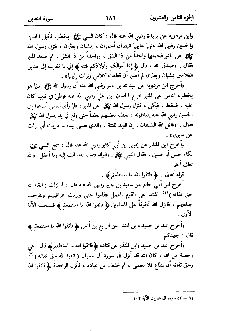 وَأخرج ابْن أبي حَاتِم عَن سعيد بن جُبَير رَضِي الله عَنهُ قَالَ: لما نزلت (اتَّقوا الله حق تُقَاته) (سُورَة آل عمرَان الْآيَة 102) اشْتَدَّ على الْقَوْم الْعَمَل فَقَامُوا حَتَّى ورمت عراقيبهم وتقرحت جباههم فَأنْزل الله تحفيفاً على الْمُسلمين {فَاتَّقُوا الله مَا اسْتَطَعْتُم} فنسخت الْآيَة الأولى