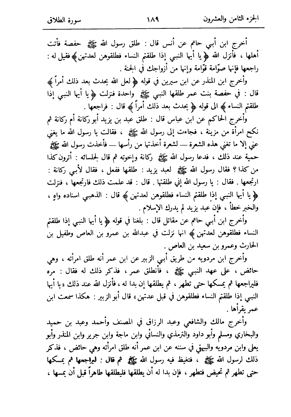 وَأخرج مَالك وَالشَّافِعِيّ وَعبد الرَّزَّاق فِي المُصَنّف وَأحمد وَعبد بن حميد وَالْبُخَارِيّ وَمُسلم وَأَبُو دَاوُد وَالتِّرْمِذِيّ وَالنَّسَائِيّ وَابْن ماجة وَابْن جرير وَابْن الْمُنْذر وَأَبُو يعلى وَابْن مرْدَوَيْه وَالْبَيْهَقِيّ فِي سنَنه عَن ابْن عمر أَنه طلق امْرَأَته وَهِي حَائِض فَذكر ذَلِك لرَسُول الله صلى الله عَلَيْهِ وَسلم فتغيظ فِيهِ رَسُول الله صلى الله عَلَيْهِ وَسلم ثمَّ قَالَ: ليراجعها ثمَّ يمْسِكهَا حَتَّى تطهر ثمَّ تحيض فَتطهر فَإِن بدا لَهُ أَن يطلقهَا فَلْيُطَلِّقهَا طَاهِرا قبل أَن يَمَسهَا