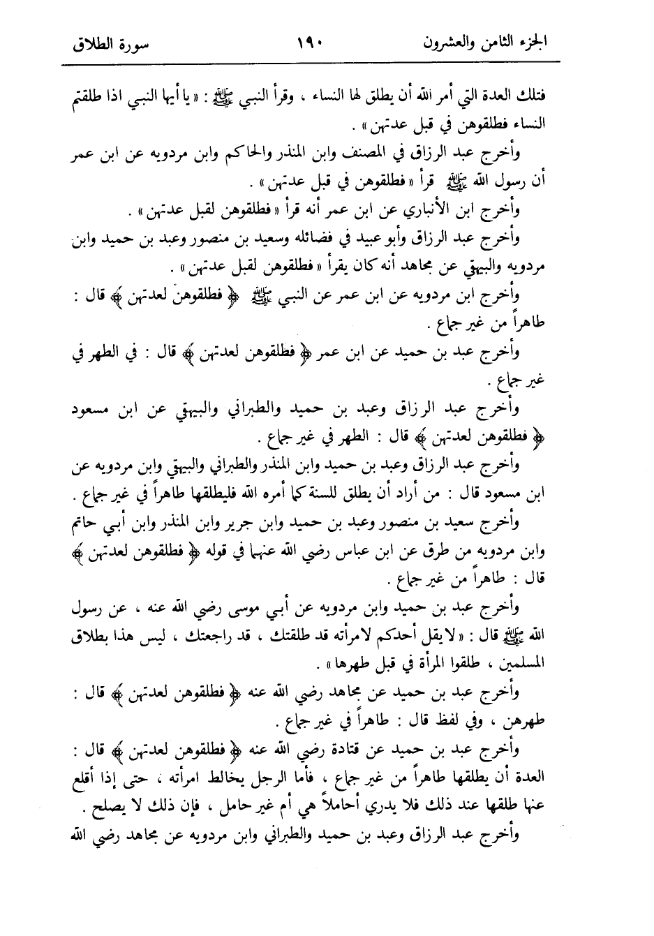 وَأخرج عبد الرَّزَّاق وَعبد بن حميد وَالطَّبَرَانِيّ وَالْبَيْهَقِيّ عَن ابْن مَسْعُود {فطلقوهن لعدتهن} قَالَ: الطُّهْر فِي غير جماع
