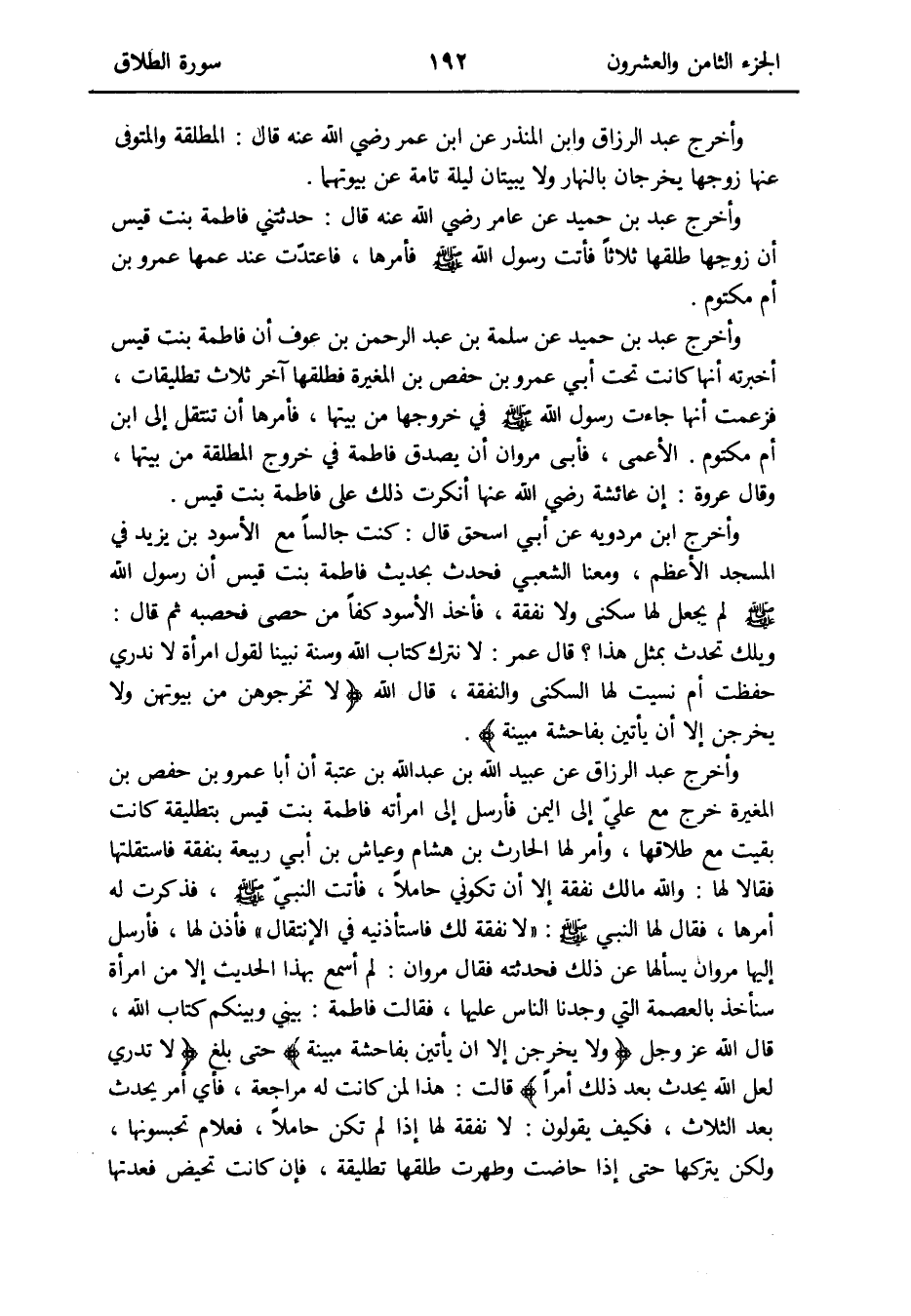 وَأخرج عبد الرَّزَّاق وَابْن الْمُنْذر عَن ابْن عمر رَضِي الله عَنهُ قَالَ: الْمُطلقَة والمتوفى عَنْهَا زَوجهَا يخرجَانِ بِالنَّهَارِ وَلَا يبيتان لَيْلَة تَامَّة عَن بيوتهما وَأخرج عبد بن حميد عَن عَامر رَضِي الله عَنهُ قَالَ: حَدَّثتنِي فَاطِمَة بنت قيس أَن زَوجهَا طَلقهَا ثَلَاثًا فَأَتَت رَسُول الله صلى الله عَلَيْهِ وَسلم فَأمرهَا فاعتدّت عِنْد عَمها عَمْرو بن أم مَكْتُوم
