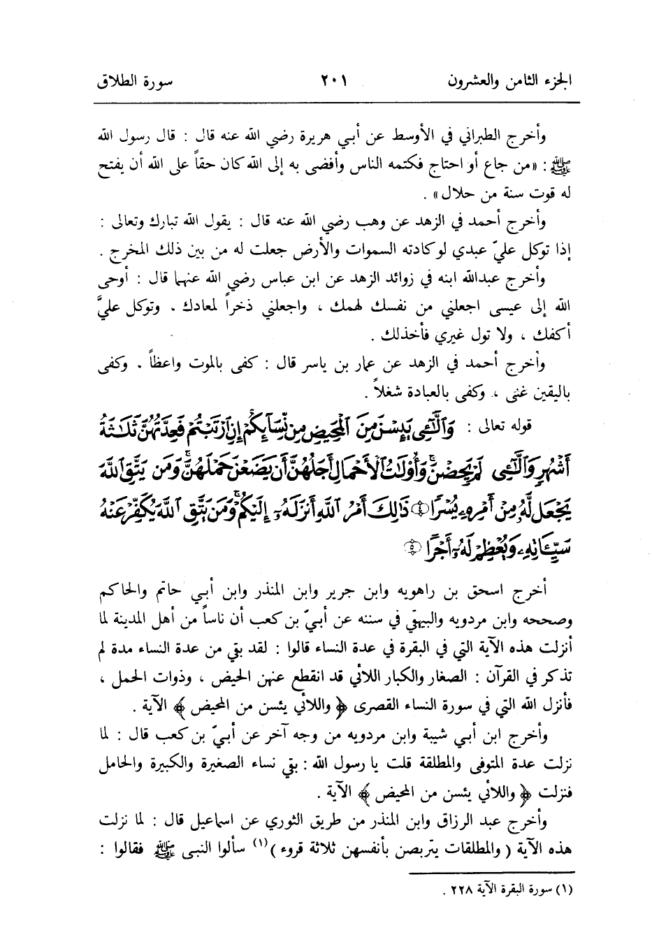 وَأخرج عبد الرَّزَّاق وَابْن الْمُنْذر من طَرِيق الثَّوْريّ عَن إِسْمَاعِيل قَالَ: لما نزلت هَذِه الْآيَة (والمطلقات يَتَرَبَّصْنَ بِأَنْفُسِهِنَّ ثَلَاثَة قُرُوء) (سُورَة الْبَقَرَة الْآيَة 228) سَأَلُوا النَّبِي صلى الله عَلَيْهِ وَسلم فَقَالُوا:
