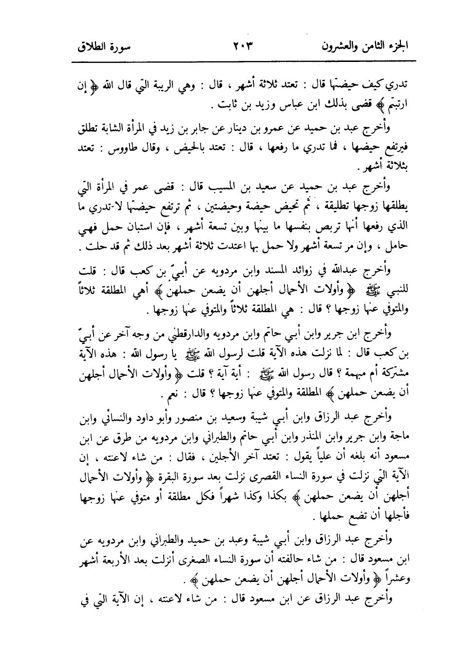 وَأخرج عبد الرَّزَّاق وَابْن أبي شيبَة وَسَعِيد بن مَنْصُور وَأَبُو دَاوُد وَالنَّسَائِيّ وَابْن ماجة وَابْن جرير وَابْن الْمُنْذر وَابْن أبي حَاتِم وَالطَّبَرَانِيّ وَابْن مرْدَوَيْه من طرق عَن ابْن مَسْعُود أَنه بلغه أَن عليا يَقُول: تَعْتَد آخر الْأَجَليْنِ فَقَالَ: من شَاءَ لَاعَنته إِن الْآيَة الَّتِي نزلت فِي سُورَة النِّسَاء الْقصرى نزلت بعد سُورَة الْبَقَرَة {وَأولَات الْأَحْمَال أَجلهنَّ أَن يَضعن حَملهنَّ} بِكَذَا وَكَذَا شهرا فَكل مُطلقَة أَو متوفى عَنْهَا زَوجهَا فأجلها أَن تضع حملهَا