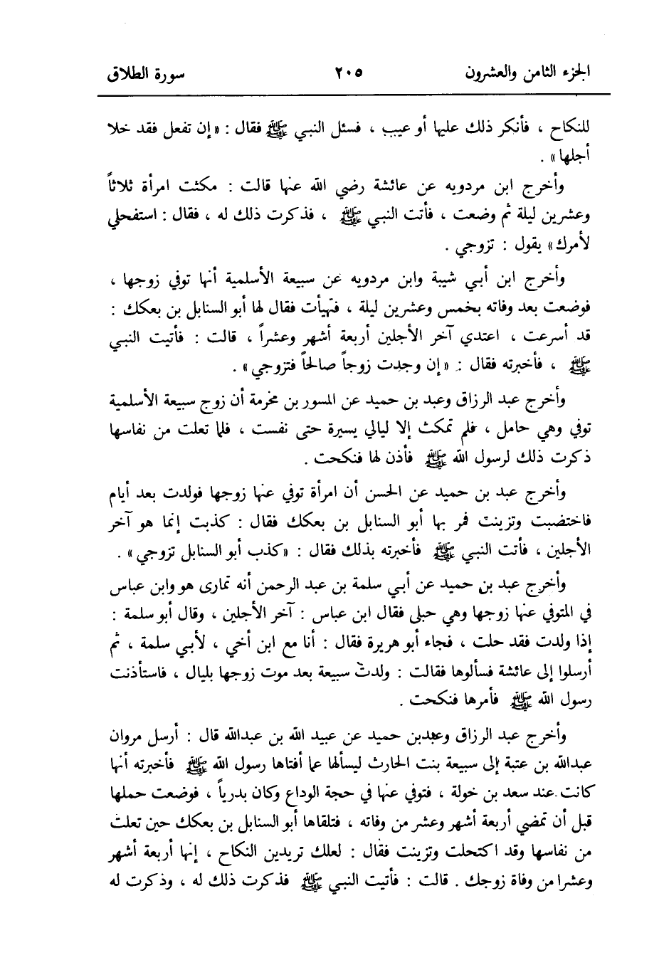 وَأخرج عبد الرَّزَّاق وَعبد بن حميد عَن عبيد الله بن عبد الله قَالَ: أرسل مَرْوَان عبد الله بن عتبَة إِلَى سبيعة بنت الْحَارِث ليسألها عَمَّا أفتاها رَسُول الله صلى الله عَلَيْهِ وَسلم فَأَخْبَرته أَنَّهَا كَانَت عِنْد سعد بن خَوْلَة فَتوفي عَنْهَا فِي حجَّة الْوَدَاع وَكَانَ بَدْرِيًّا فَوضعت حملهَا قبل أَن تمْضِي أَرْبَعَة أشهر وَعشر من وَفَاته فتلقاها أَبُو السنابل بن بعكك حِين تعلت من نفَاسهَا وَقد اكتحلت وتزينت فَقَالَ: لَعَلَّك تريدين النِّكَاح إِنَّهَا أَرْبَعَة أشهر وَعشرا من وَفَاة زَوجك
