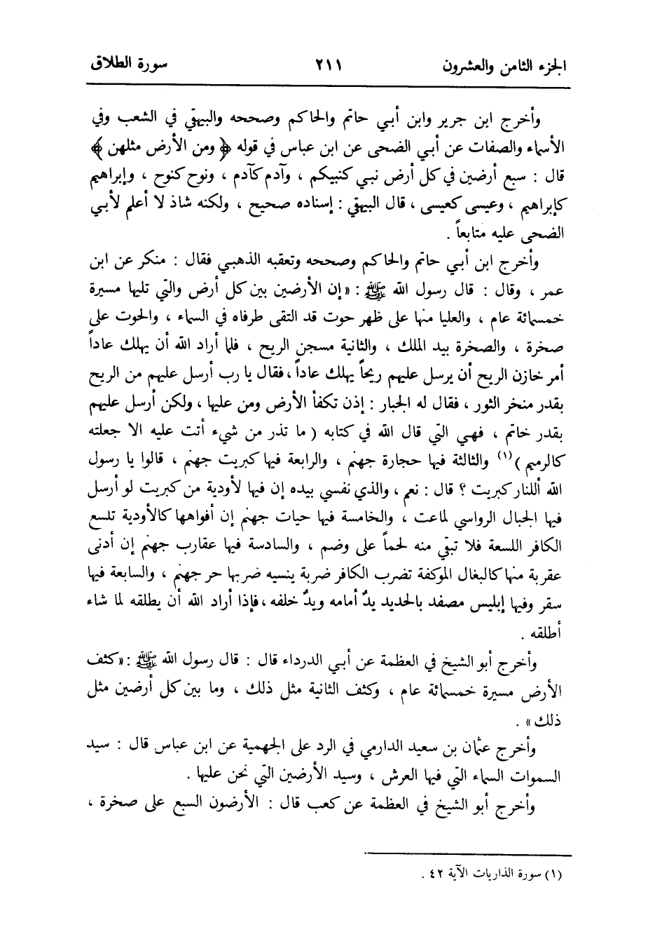 وَأخرج عُثْمَان بن سعيد الدَّارمِيّ فِي الرَّد على الجهميه عَن ابْن عَبَّاس قَالَ: سيد السَّمَوَات السَّمَاء الَّتِي فِيهَا الْعَرْش وَسيد الْأَرْضين الَّتِي نَحن عَلَيْهَا