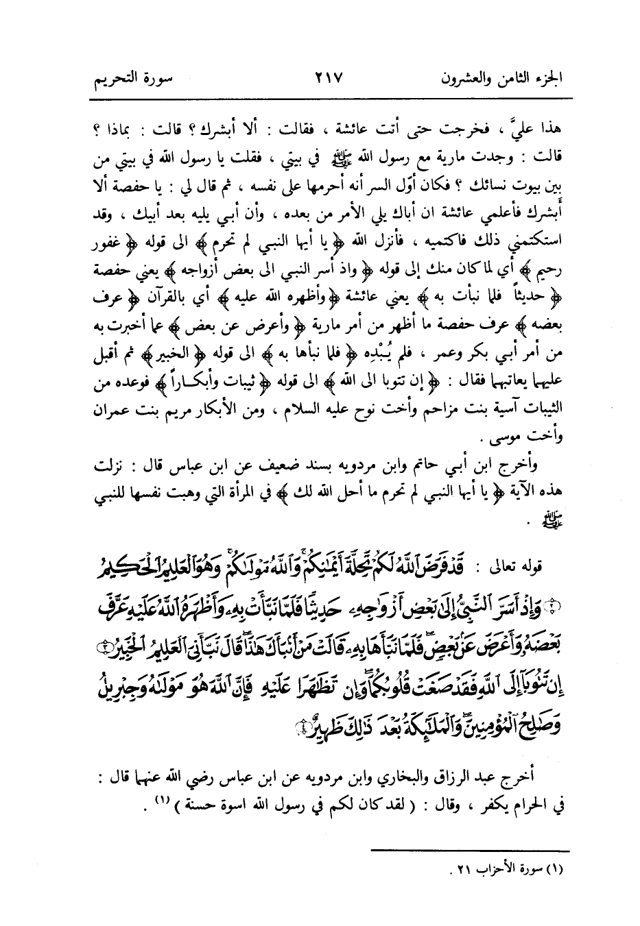 الْآيَة 2 - 4 أخرج عبد الرَّزَّاق وَالْبُخَارِيّ وَابْن مرْدَوَيْه عَن ابْن عَبَّاس رَضِي الله عَنْهُمَا قَالَ: فِي الْحَرَام يكفر وَقَالَ: (لقد كَانَ لكم فِي رَسُول الله اسوة حَسَنَة) (سُورَة الْأَحْزَاب 21)