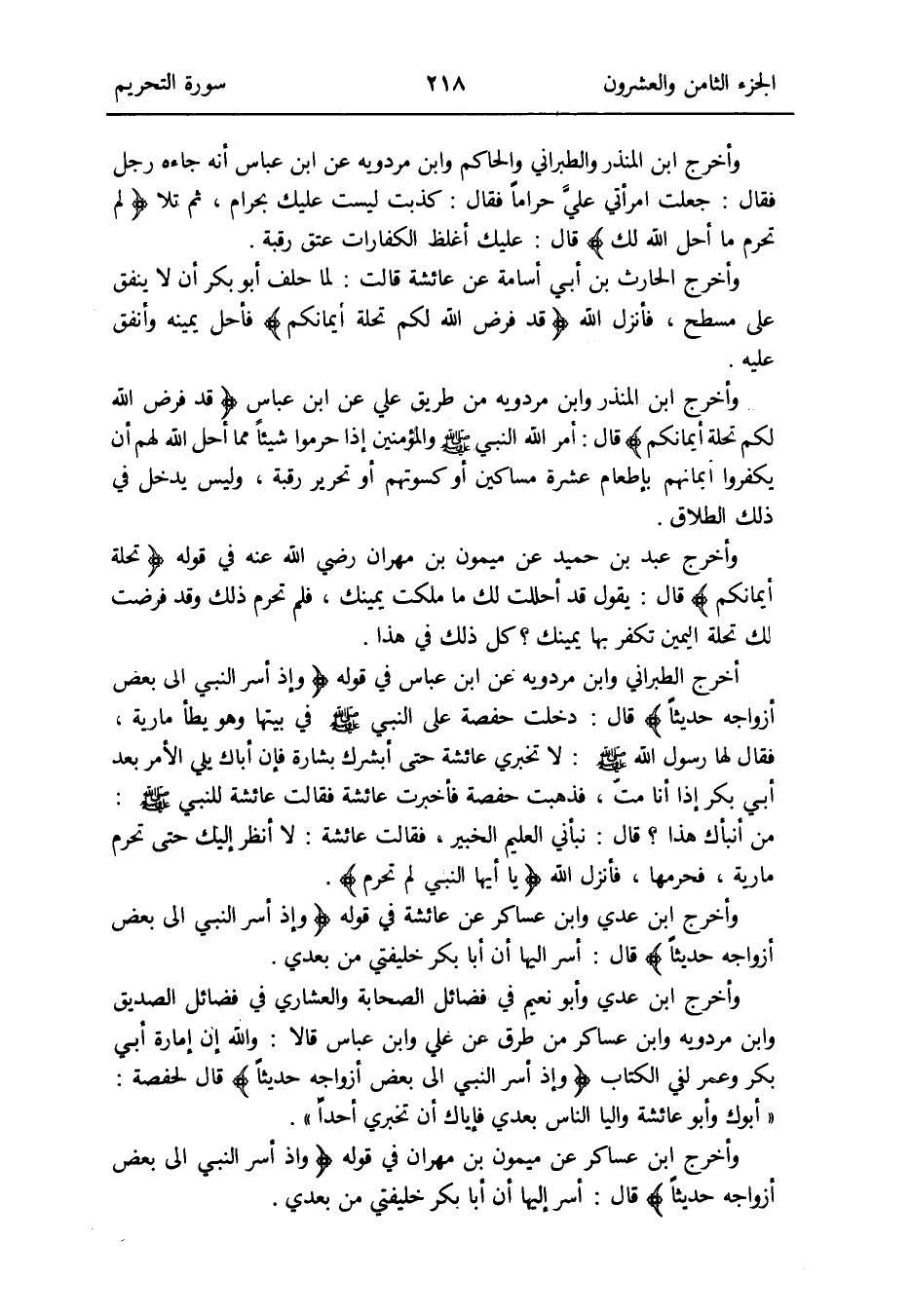 وَأخرج ابْن الْمُنْذر وَالطَّبَرَانِيّ وَالْحَاكِم وَابْن مرْدَوَيْه عَن ابْن عَبَّاس أَنه جَاءَهُ رجل فَقَالَ: جعلت امْرَأَتي عليَّ حَرَامًا فَقَالَ: كذبت لَيست عَلَيْك بِحرَام ثمَّ تَلا {لم تحرم مَا أحل الله لَك} قَالَ: عَلَيْك أغْلظ الْكَفَّارَات عتق رَقَبَة