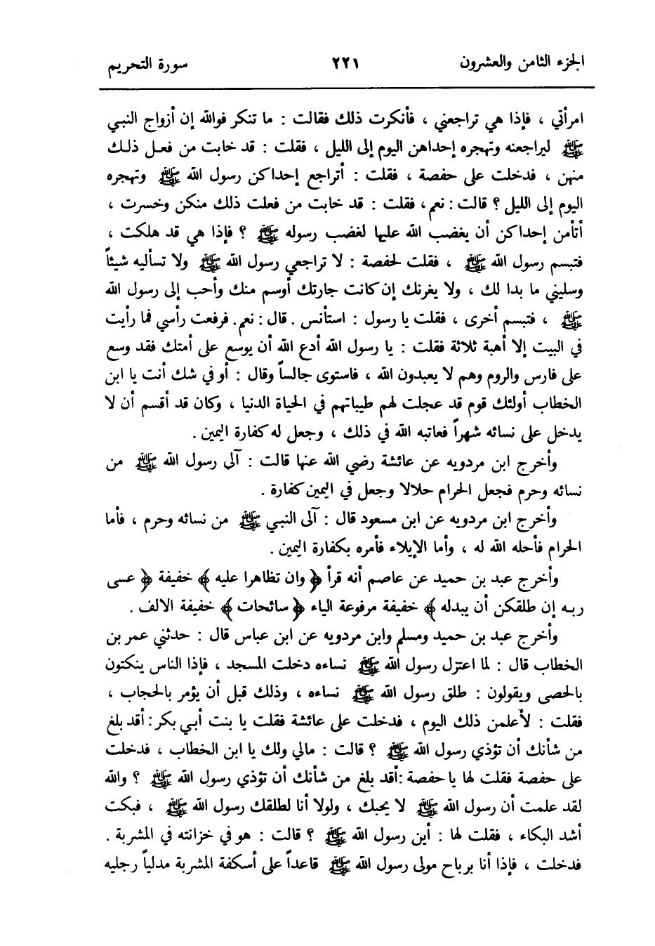 امْرَأَتي فَإِذا هِيَ تراجعني فأنكرت ذَلِك فَقَالَت: مَا تنكر فوَاللَّه إِن أَزوَاج النَّبِي صلى الله عَلَيْهِ وَسلم ليراجعنه وتهجره إِحْدَاهُنَّ الْيَوْم إِلَى اللَّيْل فَقلت: قد خابت من فعل ذَلِك مِنْهُنَّ فَدخلت على حَفْصَة فَقلت: أتراجع إحداكن رَسُول الله صلى الله عَلَيْهِ وَسلم وتهجره الْيَوْم إِلَى اللَّيْل نعم فَقلت: قد خابت من فعلت ذَلِك مِنْكُن وخسرت أتأمن إحداكن أَن يغْضب الله عَلَيْهَا لغضب رَسُوله صلى الله عَلَيْهِ وَسلم فَإِذا هِيَ قد هَلَكت فَتَبَسَّمَ رَسُول الله صلى الله عَلَيْهِ وَسلم فَقلت لحفصة: لَا تراجعي رَسُول الله صلى الله عَلَيْهِ وَسلم وَلَا تسأليه شَيْئا وسليني مَا بدا لَك وَلَا يغرنك إِن كَانَت جارتك أوسم مِنْك وَأحب إِلَى رَسُول الله صلى الله عَلَيْهِ وَسلم فَتَبَسَّمَ أُخْرَى فَقلت يَا رَسُول الله: استأنس قَالَ: نعم فَرفعت رَأْسِي فَمَا رَأَيْت فِي الْبَيْت إِلَّا أهبة ثَلَاثَة فَقلت: يَا رَسُول الله ادْع الله أَن يُوسع على أمتك فقد وسع على فَارس وَالروم وهم لَا يعْبدُونَ الله فَاسْتَوَى جَالِسا وَقَالَ: أَو فِي شكّ أَنْت يَا ابْن الْخطاب أُولَئِكَ قوم قد عجلت لَهُم طَيِّبَاتهمْ فِي الْحَيَاة الدُّنْيَا وَكَانَ قد أقسم أَن لَا يدْخل على نِسَائِهِ شهرا فَعَاتَبَهُ الله فِي ذَلِك وَجعل لَهُ كَفَّارَة الْيَمين