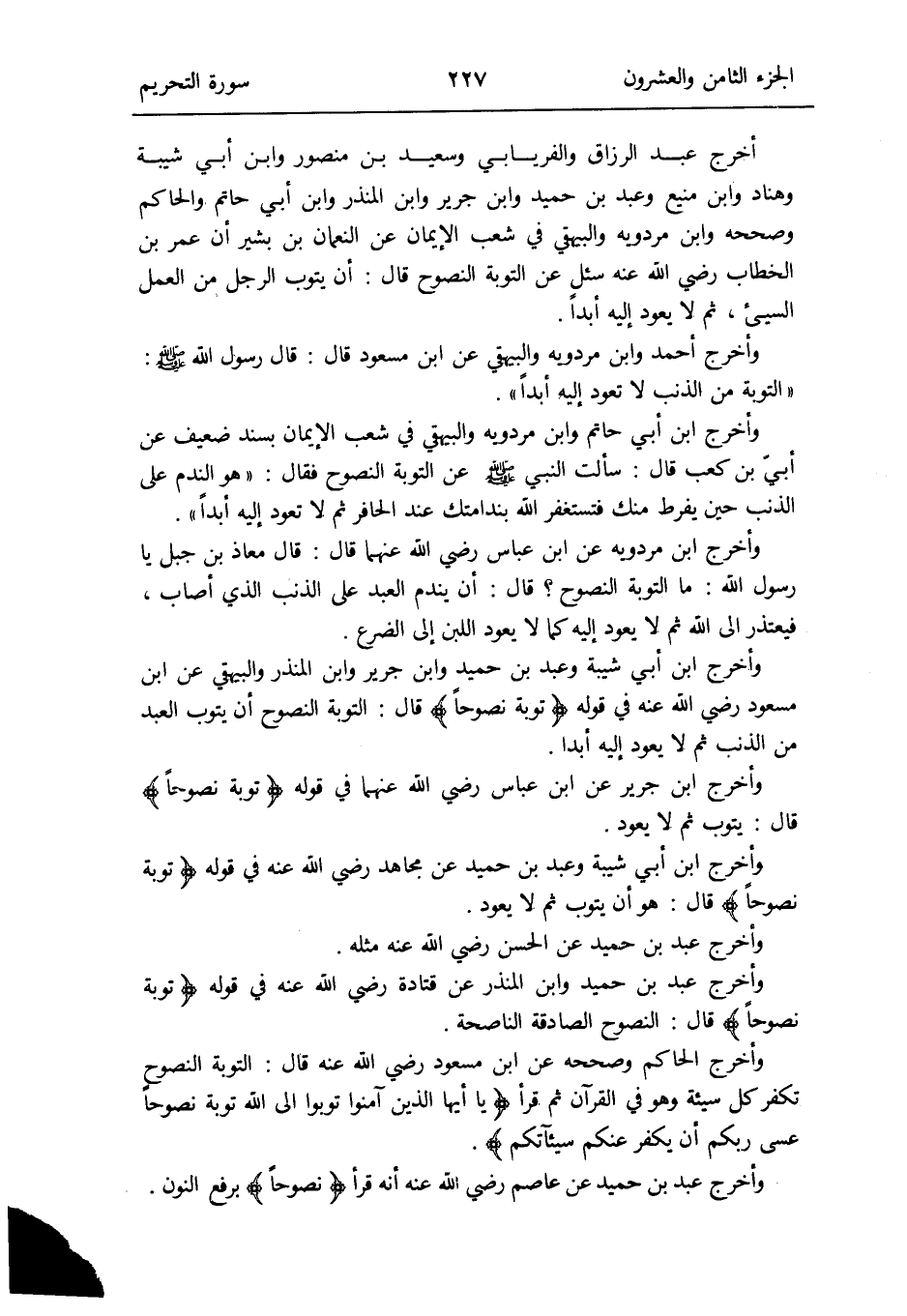 وَأخرج ابْن جرير عَن ابْن عَبَّاس رَضِي الله عَنْهُمَا فِي قَوْله: {تَوْبَة نصُوحًا} قَالَ: يَتُوب ثمَّ لَا يعود