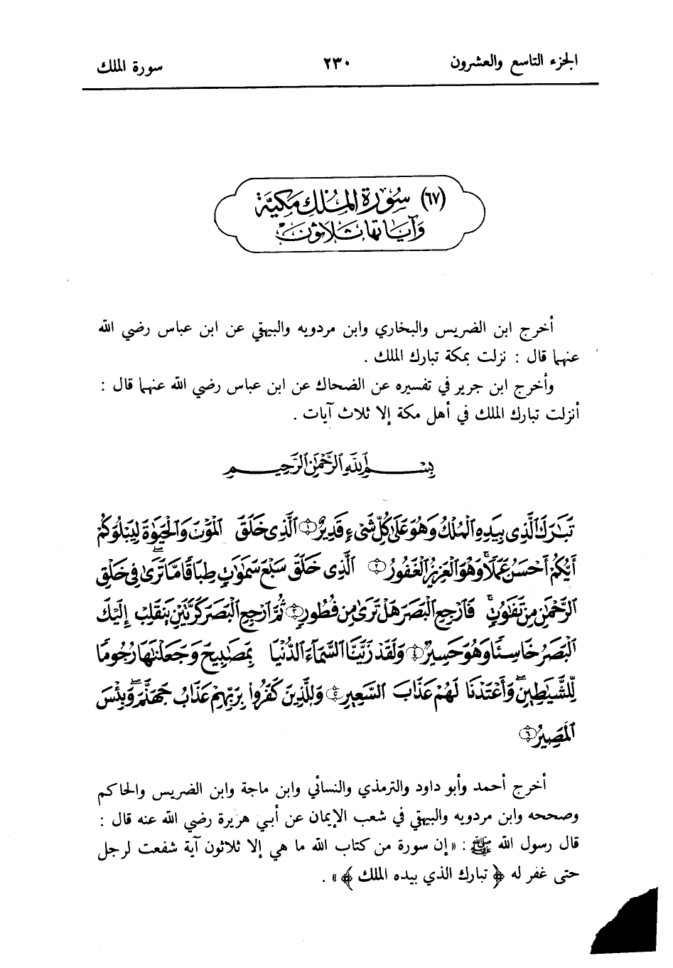 أخرج أَحْمد وَأَبُو دَاوُد وَالتِّرْمِذِيّ وَالنَّسَائِيّ وَابْن ماجة وَابْن الضريس وَالْحَاكِم وَصَححهُ وَابْن مرديه وَالْبَيْهَقِيّ فِي شعب الإِيمان عَن أبي هُرَيْرَة رَضِي الله عَنهُ قَالَ: قَالَ رَسُول الله صلى الله عَلَيْهِ وَسلم: إِن سُورَة من كتاب الله مَا هِيَ إِلَّا ثَلَاثُونَ آيَة شفعت لرجل حَتَّى غفر لَهُ {تبَارك الَّذِي بِيَدِهِ الْملك}