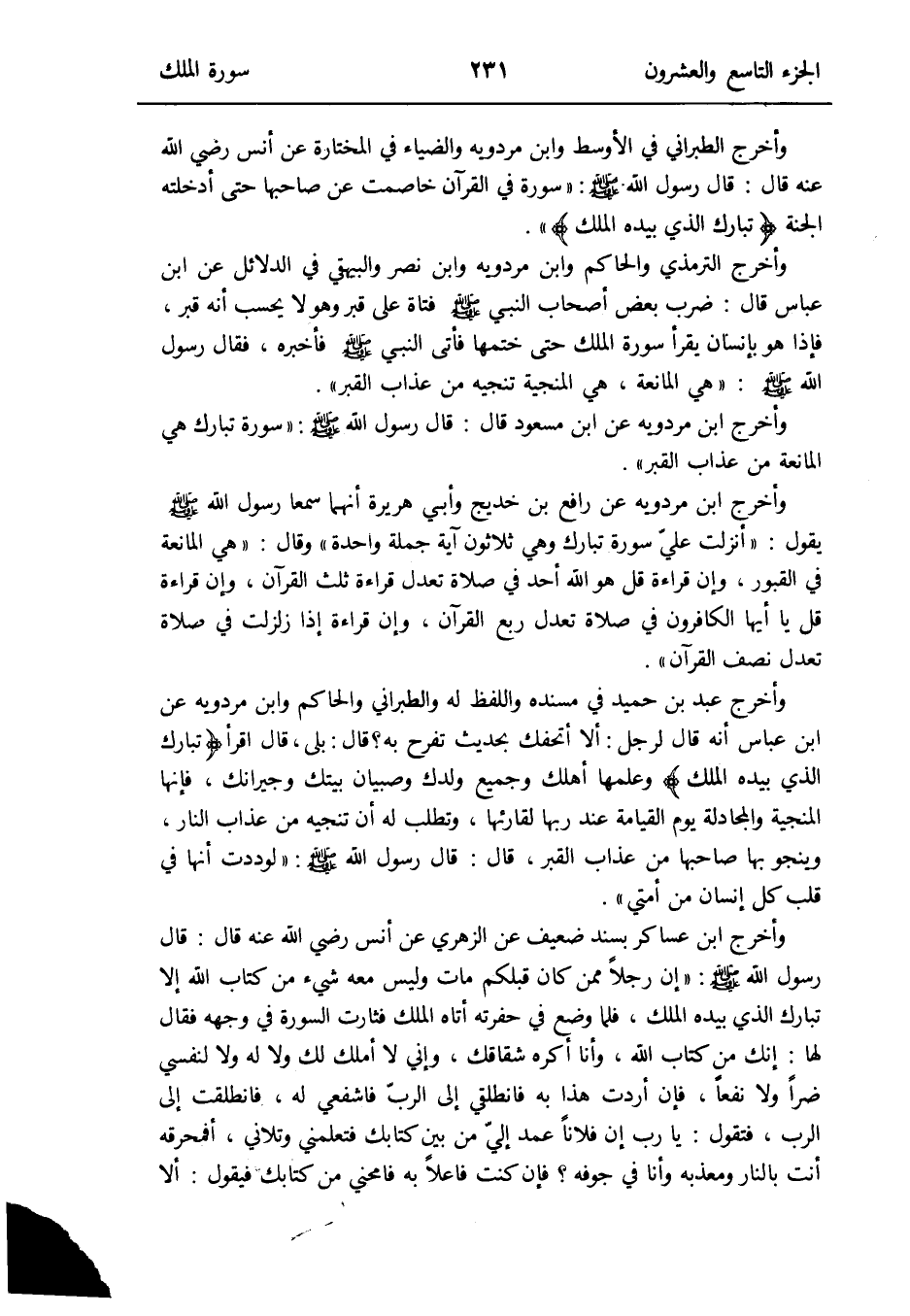 وَأخرج التِّرْمِذِيّ وَالْحَاكِم وَابْن مرْدَوَيْه وَابْن نصر وَالْبَيْهَقِيّ فِي الدَّلَائِل عَن ابْن عَبَّاس قَالَ: ضرب بعض أَصْحَاب النَّبِي صلى الله عَلَيْهِ وَسلم فتاة على قبر وَهُوَ لَا يحْسب أَنه قبر فَإِذا هُوَ بِإِنْسَان يقْرَأ سُورَة الْملك حَتَّى خَتمهَا فَأتى النَّبِي صلى الله عَلَيْهِ وَسلم فَأخْبرهُ فَقَالَ رَسُول الله صلى الله عَلَيْهِ وَسلم: هِيَ الْمَانِعَة هِيَ المنجية تنجيه من عَذَاب الْقَبْر وَأخرج ابْن مرْدَوَيْه عَن ابْن مَسْعُود قَالَ: قَالَ رَسُول الله صلى الله عَلَيْهِ وَسلم: سُورَة تبَارك هِيَ الْمَانِعَة من عَذَاب الْقَبْر