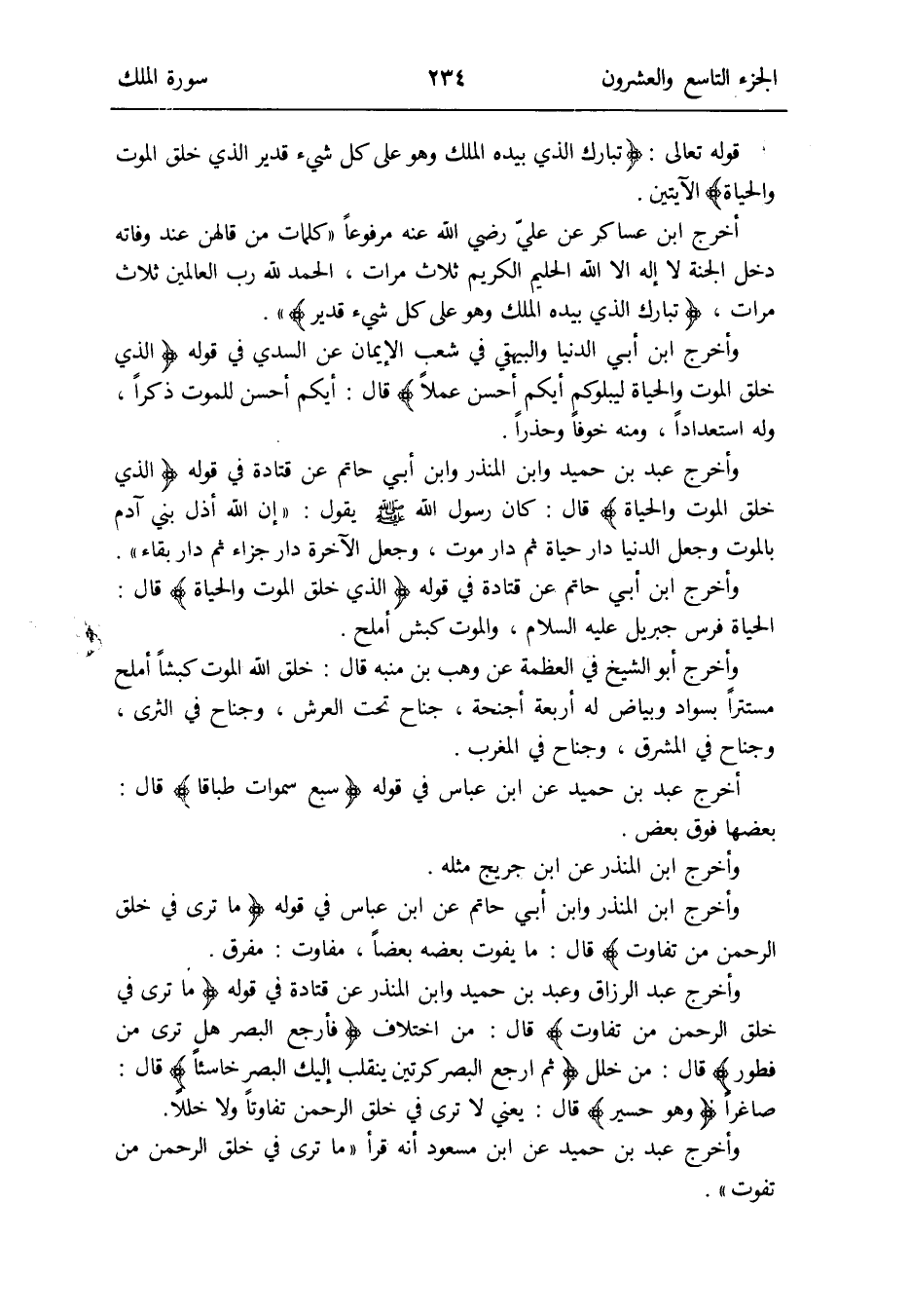 أخرج ابْن عَسَاكِر عَن عَليّ رَضِي الله عَنهُ مَرْفُوعا كَلِمَات من قالهن عَن وَفَاته دخل الْجنَّة لَا إِلَه إِلَّا الله الْحَلِيم الْكَرِيم ثَلَاث مَرَّات الْحَمد لله رب الْعَالمين ثَلَاث مَرَّات {تبَارك الَّذِي بِيَدِهِ الْملك وَهُوَ على كل شَيْء قدير}