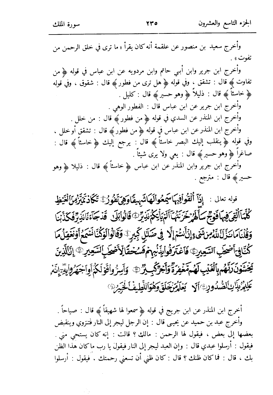 وَأخرج ابْن جرير وَابْن أبي حَاتِم وَابْن مرْدَوَيْه عَن ابْن عَبَّاس فِي قَوْله: {من تفَاوت} قَالَ: تشقق وَفِي قَوْله: {هَل ترى من فطور} قَالَ: شقوق وَفِي قَوْله: {خاسئاً} قَالَ: ذليلاً {وَهُوَ حسير} قَالَ: كليل