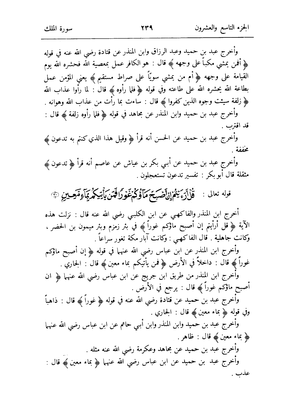 وَأخرج ابْن الْمُنْذر من طَرِيق ابْن جريج عَن ابْن عَبَّاس رَضِي الله عَنْهُمَا {إِن أصبح ماؤكم غوراً} قَالَ: يرجع فِي الأَرْض