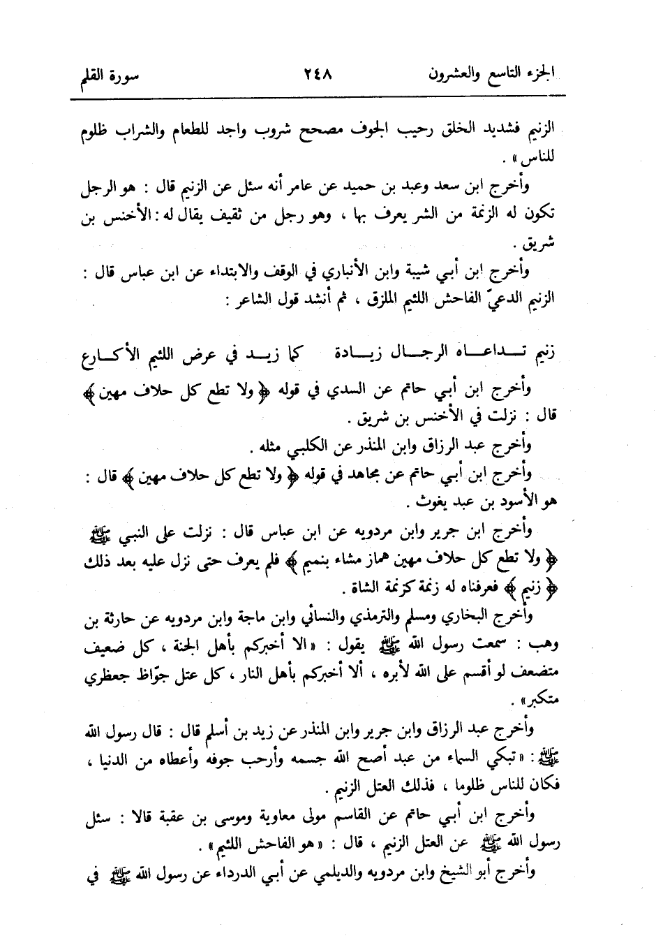 وَأخرج ابْن أبي شيبَة وَابْن الْأَنْبَارِي فِي الْوَقْف والابتداء عَن ابْن عَبَّاس قَالَ: الزنيم الدعيّ الْفَاحِش اللَّئِيم الملزق ثمَّ أنْشد قَول الشَّاعِر: زنيم تدعاه الرِّجَال زِيَادَة كَمَا زيد فِي عرض اللَّئِيم الأكارع وَأخرج ابْن أبي حَاتِم عَن السّديّ فِي قَوْله: {وَلَا تُطِع كل حلاف مهين} قَالَ: نزلت فِي الْأَخْنَس بن شريق
