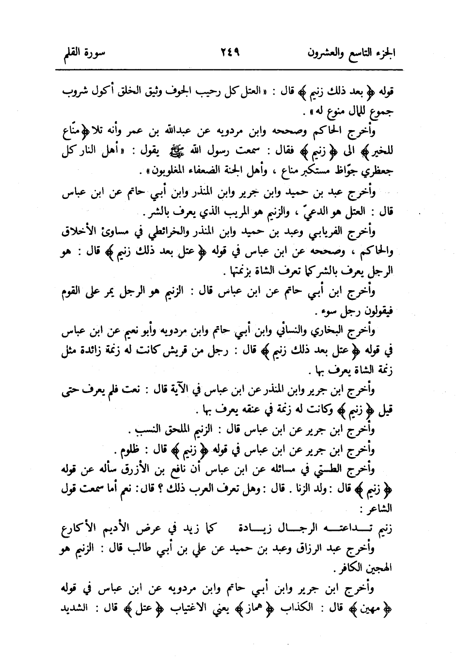 وَأخرج الْفرْيَابِيّ وَعبد بن حميد وَابْن الْمُنْذر والخرائطي فِي مساوئ الْأَخْلَاق وَالْحَاكِم وَصَححهُ عَن ابْن عَبَّاس فِي قَوْله: {عتل بعد ذَلِك زنيم} قَالَ: هُوَ الرجل يعرف بِالشَّرِّ كَمَا تعرف الشَّاة بزنمتها