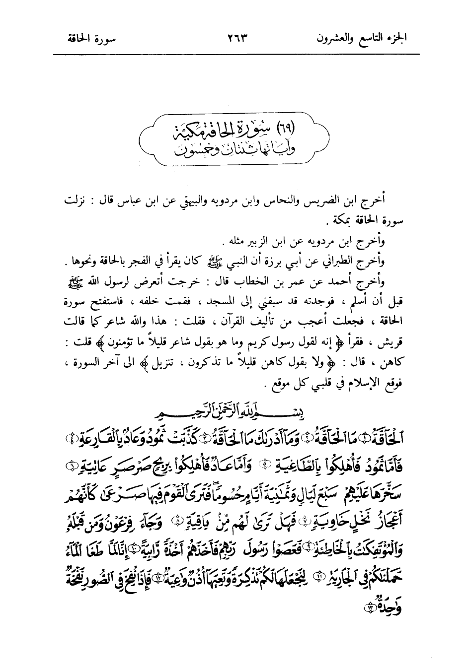 مُقَدّمَة السُّورَة أخرج ابْن الضريس والنحاس وَابْن مرْدَوَيْه وَالْبَيْهَقِيّ عَن ابْن عَبَّاس قَالَ: نزلت سُورَة الحاقة بِمَكَّة