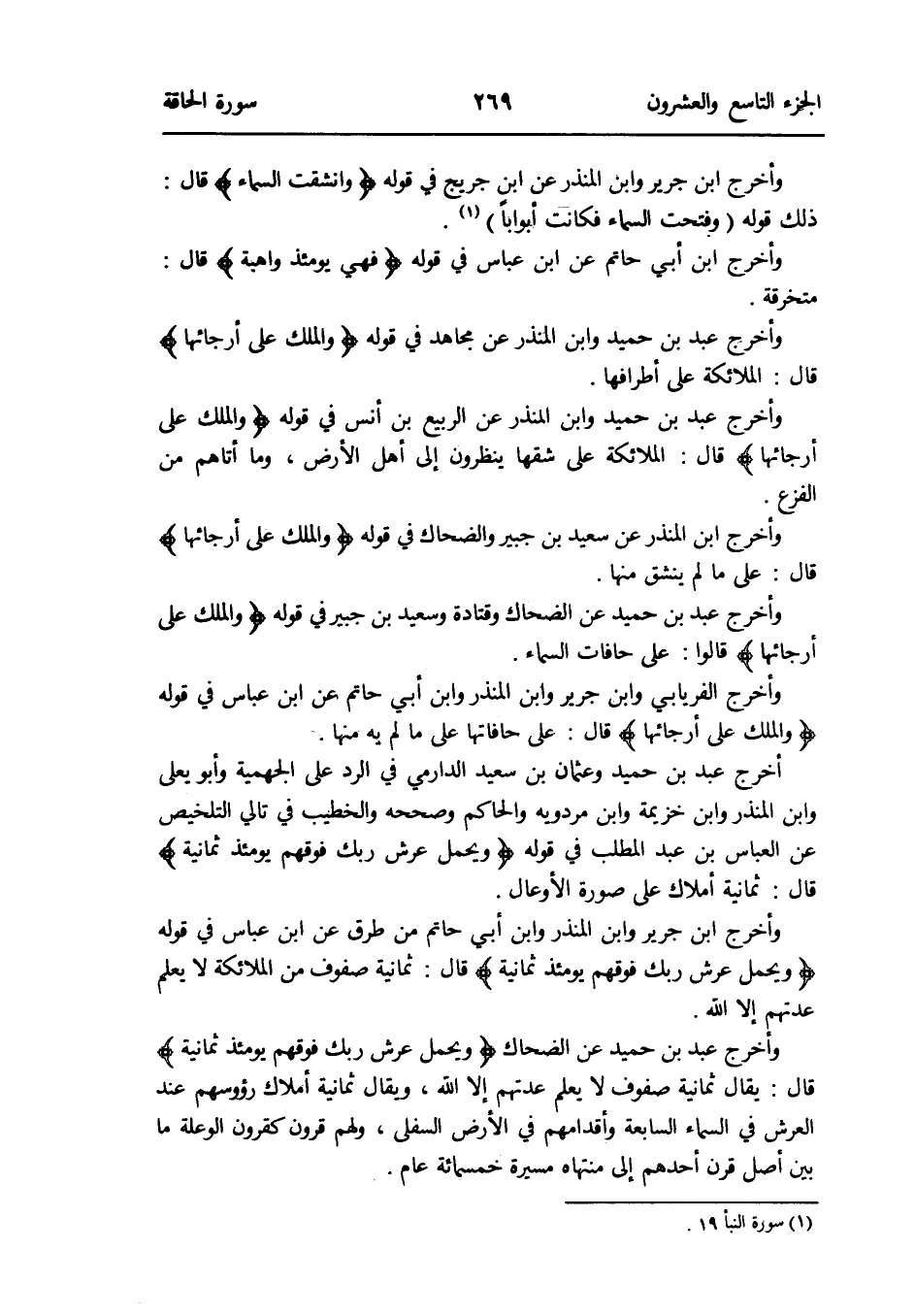 وَأخرج ابْن جرير وَابْن الْمُنْذر وَابْن أبي حَاتِم من طرق عَن ابْن عَبَّاس فِي قَوْله: {وَيحمل عرش رَبك فَوْقهم يَوْمئِذٍ ثَمَانِيَة} قَالَ: ثَمَانِيَة صُفُوف من الْمَلَائِكَة لَا يعلم عدتهمْ إِلَّا الله