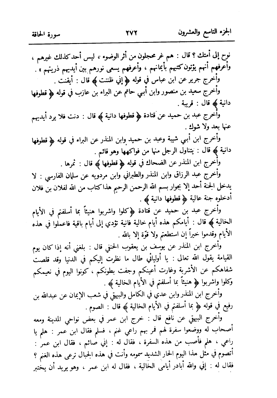 وَأخرج ابْن الْمُنْذر وَابْن عدي فِي الْكَامِل وَالْبَيْهَقِيّ فِي شعب الإِيمان عَن عبد الله بن رفيع فِي قَوْله: {بِمَا أسلفتم فِي الْأَيَّام الخالية} قَالَ: الصَّوْم