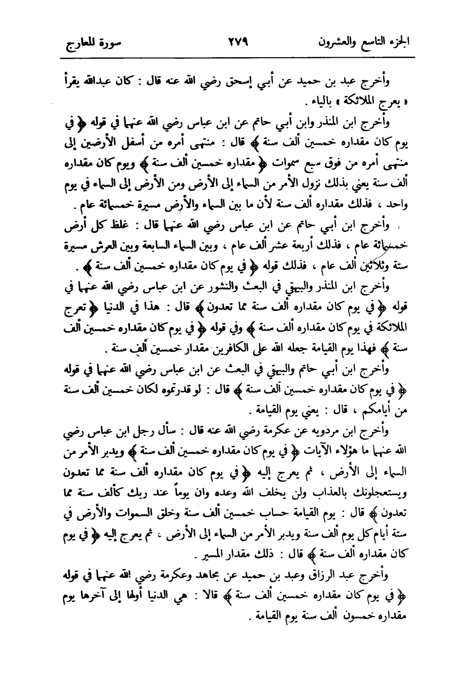 وَأخرج ابْن الْمُنْذر وَابْن أبي حَاتِم عَن ابْن عَبَّاس رَضِي الله عَنْهُمَا فِي قَوْله: {فِي يَوْم كَانَ مِقْدَاره خمسين ألف سنة} قَالَ: مُنْتَهى أمره من أَسْفَل الْأَرْضين إِلَى مُنْتَهى أمره من فَوق سبع سموات {مِقْدَاره خمسين ألف سنة} وَيَوْم كَانَ مِقْدَاره ألف سنة يَعْنِي بذلك نزُول الْأَمر من السَّمَاء إِلَى الأَرْض وَمن الأَرْض إِلَى السَّمَاء فِي يَوْم وَاحِد فَذَلِك مِقْدَاره ألف سنة لِأَن مَا بَين السَّمَاء وَالْأَرْض مسيرَة خَمْسمِائَة عَام