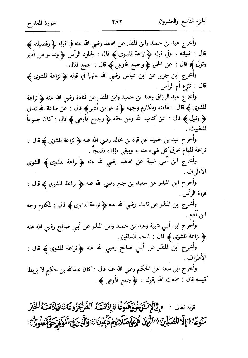 وَأخرج عبد الرَّزَّاق وَعبد بن حميد وَابْن الْمُنْذر عَن قَتَادَة رَضِي الله عَنهُ {نزاعة للشوى} قَالَ: لهامته وَمَكَارِم وَجهه {تَدْعُو من أدبر} قَالَ: عَن طَاعَة الله تَعَالَى {وَتَوَلَّى} قَالَ: عَن كتاب الله وَعَن حَقه {وَجمع فأوعى} قَالَ: كَانَ جموعاً للخبيث
