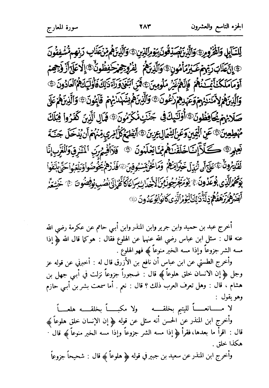 أخرج عبد بن حميد وَابْن جرير وَابْن الْمُنْذر وَابْن أبي حَاتِم عَن عِكْرِمَة رَضِي الله عَنهُ قَالَ: سُئِلَ ابْن عَبَّاس رَضِي الله عَنْهُمَا عَن الهلوع فَقَالَ: هُوَ كَمَا قَالَ الله: {إِذا مَسّه الشَّرّ جزوعاً وَإِذا مَسّه الْخَيْر منوعاً} فَهُوَ الهلوع