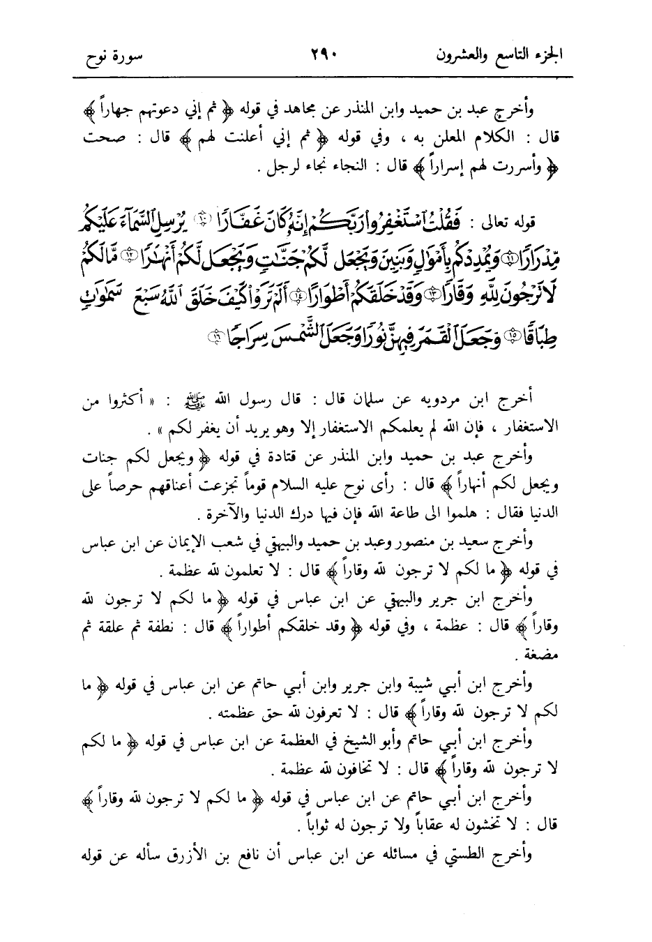 وَأخرج سعيد بن مَنْصُور وَعبد بن حميد وَالْبَيْهَقِيّ فِي شعب الإِيمان عَن ابْن عَبَّاس فِي قَوْله: {مَا لكم لَا ترجون لله وقاراً} قَالَ: لَا تعلمُونَ لله عَظمَة