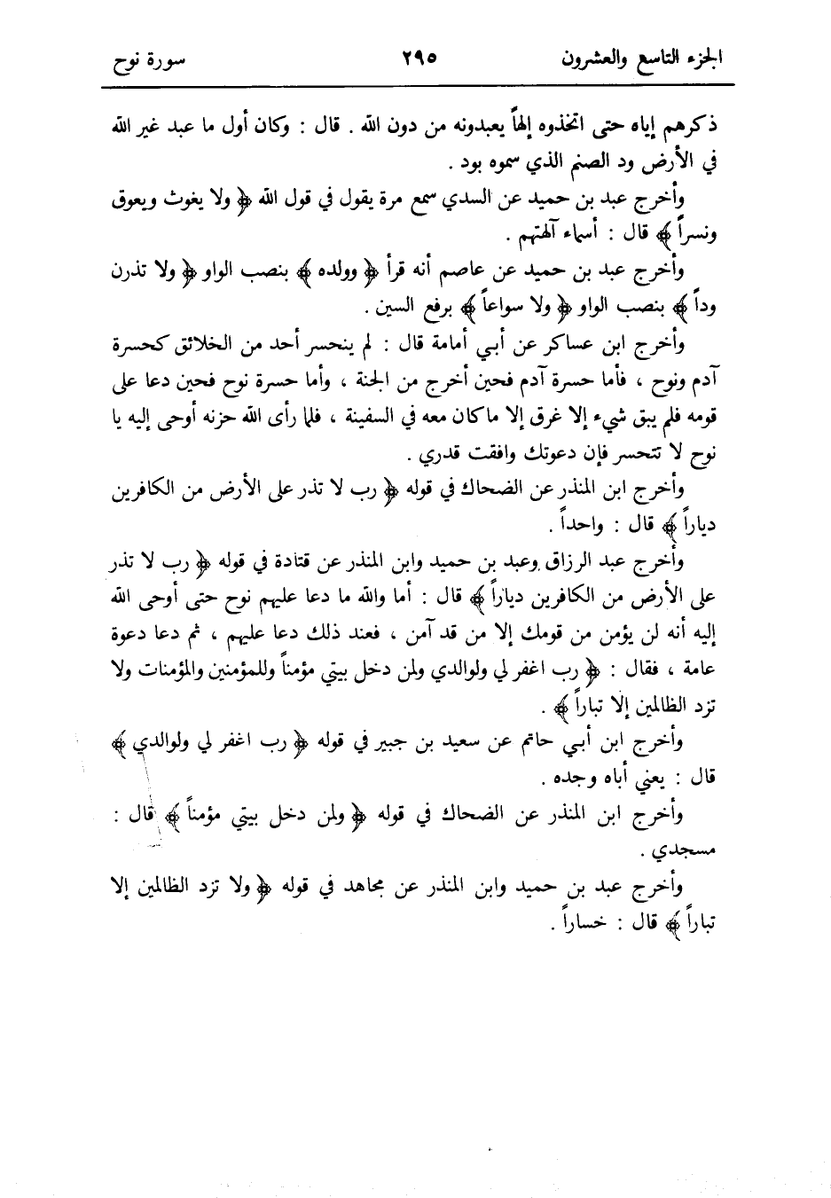 وَأخرج عبد الرَّزَّاق وَعبد بن حميد وَابْن الْمُنْذر عَن قَتَادَة فِي قَوْله: {رب لَا تذر على الأَرْض من الْكَافرين ديارًا} قَالَ: أما وَالله مَا دَعَا عَلَيْهِم نوح حَتَّى أوحى الله إِلَيْهِ أَنه لن يُؤمن من قَوْمك إِلَّا من قد آمن فَعِنْدَ ذَلِك دَعَا عَلَيْهِم ثمَّ دَعَا دَعْوَة عَامَّة فَقَالَ: {رب اغْفِر لي ولوالدي وَلمن دخل بَيْتِي مُؤمنا وَلِلْمُؤْمنِينَ وَالْمُؤْمِنَات وَلَا تزد الظَّالِمين إِلَّا تباراً}