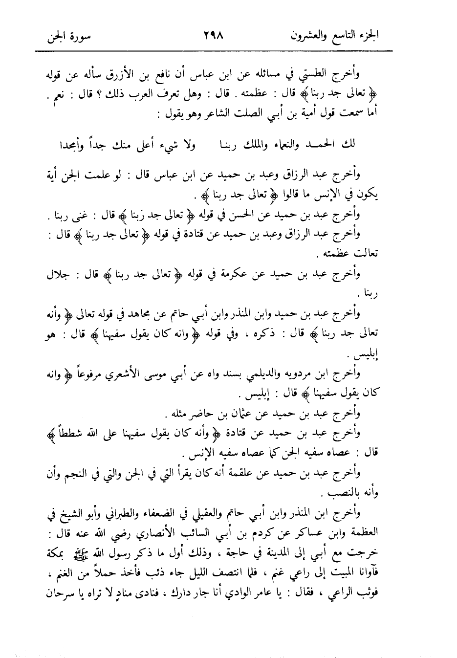وَأخرج عبد بن حميد وَابْن الْمُنْذر وَابْن أبي حَاتِم عَن مُجَاهِد فِي قَوْله تَعَالَى: {وَأَنه تَعَالَى جد رَبنَا} قَالَ: ذكره وَفِي قَوْله: {وَأَنه كَانَ يَقُول سفيهنا} قَالَ: هُوَ إِبْلِيس