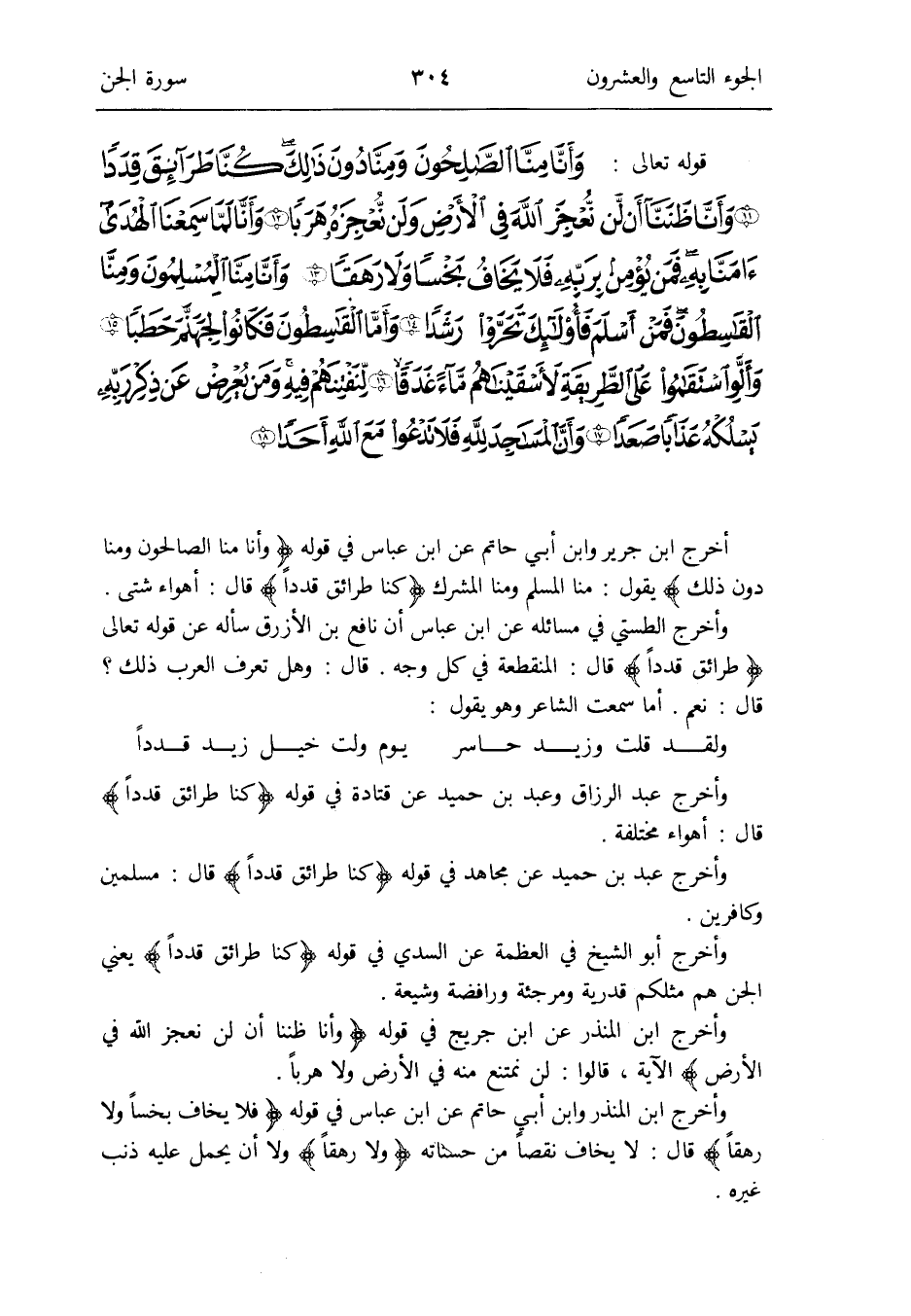أخرج ابْن جرير وَابْن أبي حَاتِم عَن ابْن عَبَّاس فِي قَوْله: {وَأَنا منا الصالحون وَمنا دون ذَلِك} يَقُول: منا الْمُسلم وَمنا الْمُشرك {كُنَّا طرائق قدداً} قَالَ: أهواء شَتَّى