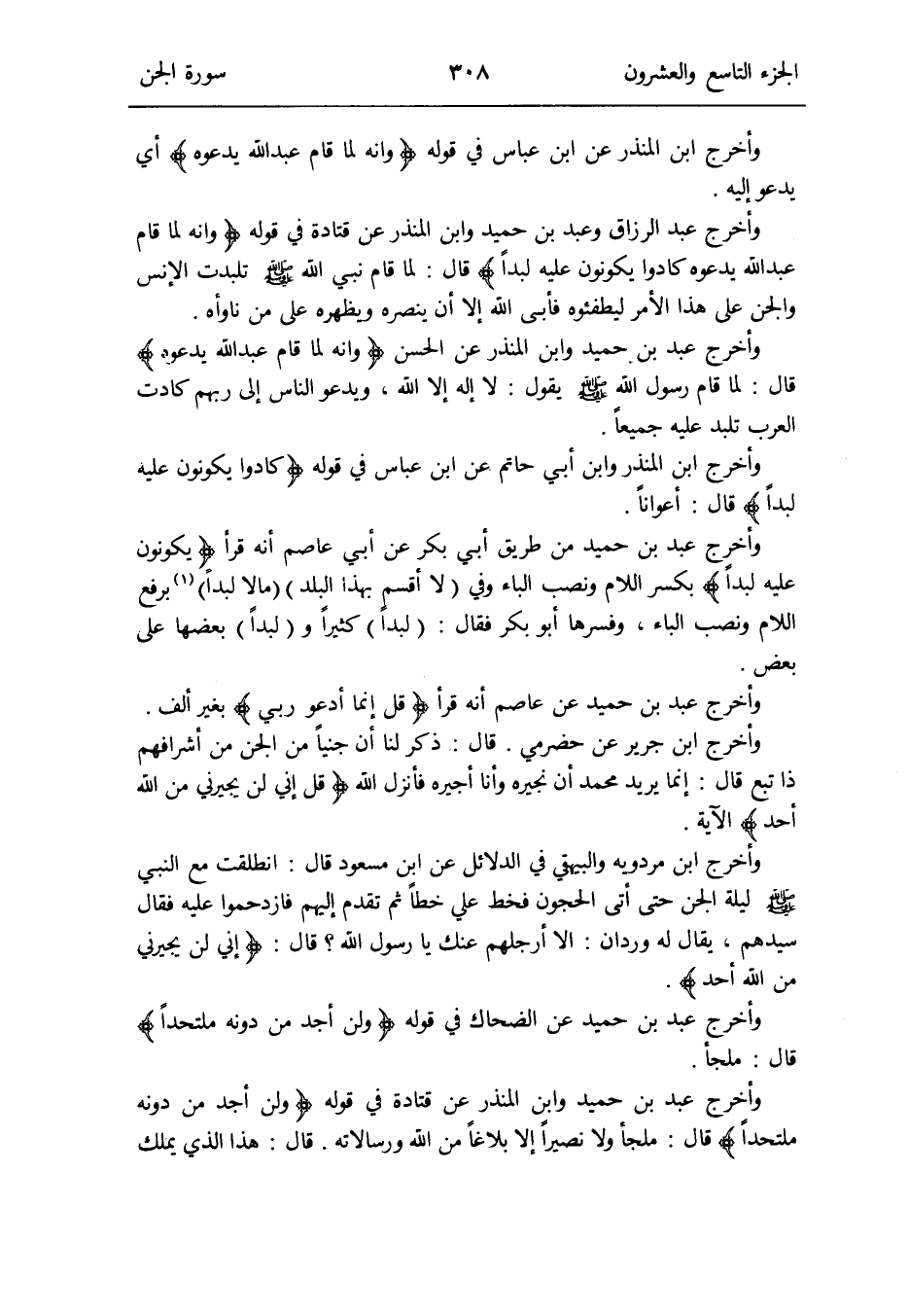 وَأخرج عبد الرَّزَّاق وَعبد بن حميد وَابْن الْمُنْذر عَن قَتَادَة فِي قَوْله: {وَإنَّهُ لما قَامَ عبد الله يَدعُوهُ كَادُوا يكونُونَ عَلَيْهِ لبداً} قَالَ: لما قَامَ نَبِي الله صلى الله عَلَيْهِ وَسلم تلبدت الإِنس وَالْجِنّ على هَذَا الْأَمر ليطفئوه فَأبى الله إِلَّا أَن ينصره ويظهره على من ناوأه