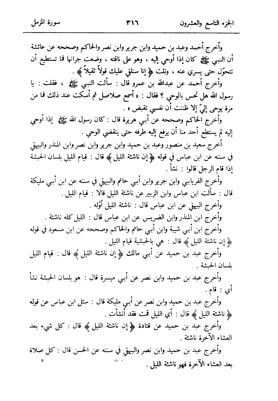 وَأخرج ابْن أبي شيبَة وَابْن أبي حَاتِم وَالْحَاكِم وَصَححهُ عَن ابْن مَسْعُود فِي قَوْله: {إِن ناشئة اللَّيْل} قَالَ: هِيَ بالحبشية قيام اللَّيْل