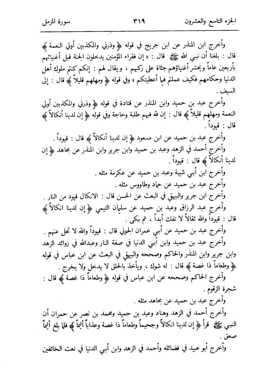 وَأخرج عبد بن حميد وَابْن الْمُنْذر عَن قَتَادَة فِي قَوْله: {وذرني والمكذبين أولي النِّعْمَة ومهلهم قَلِيلا} قَالَ: إِن لله فيهم طلبة وحاجة وَفِي قَوْله: {إِن لدينا أَنْكَالًا} قَالَ: قيوداً